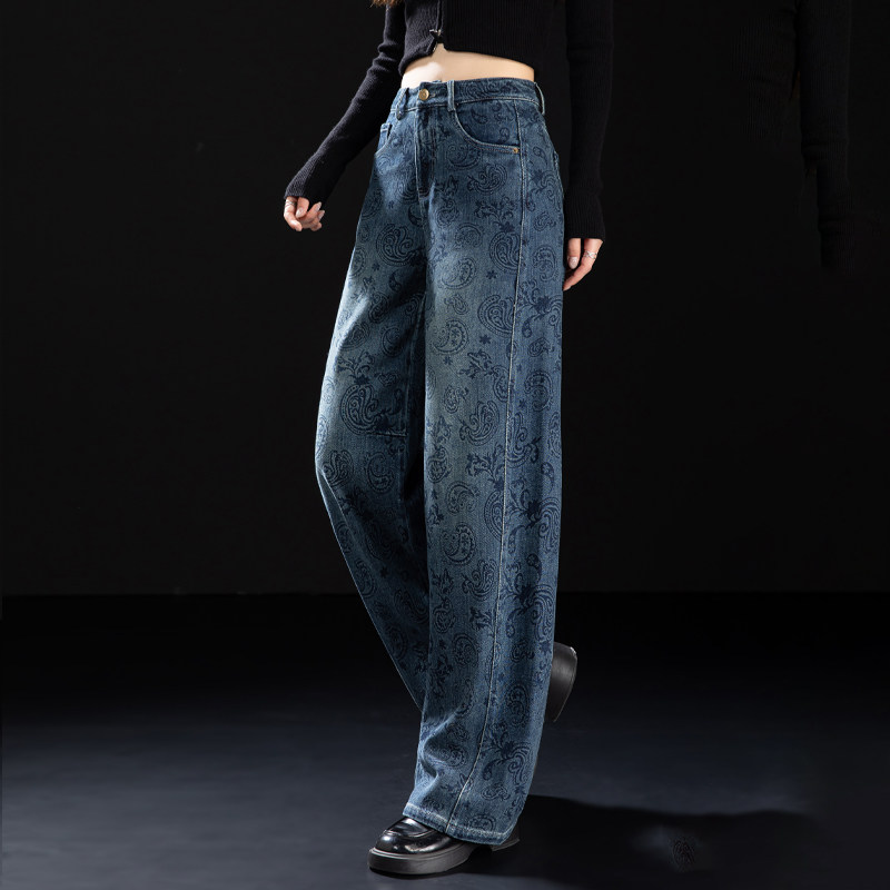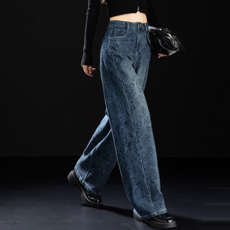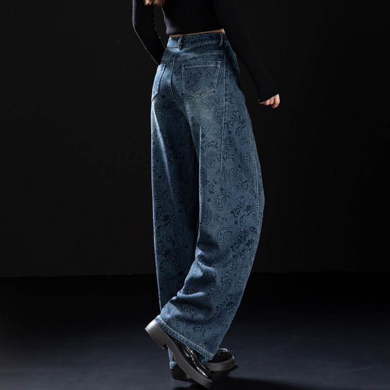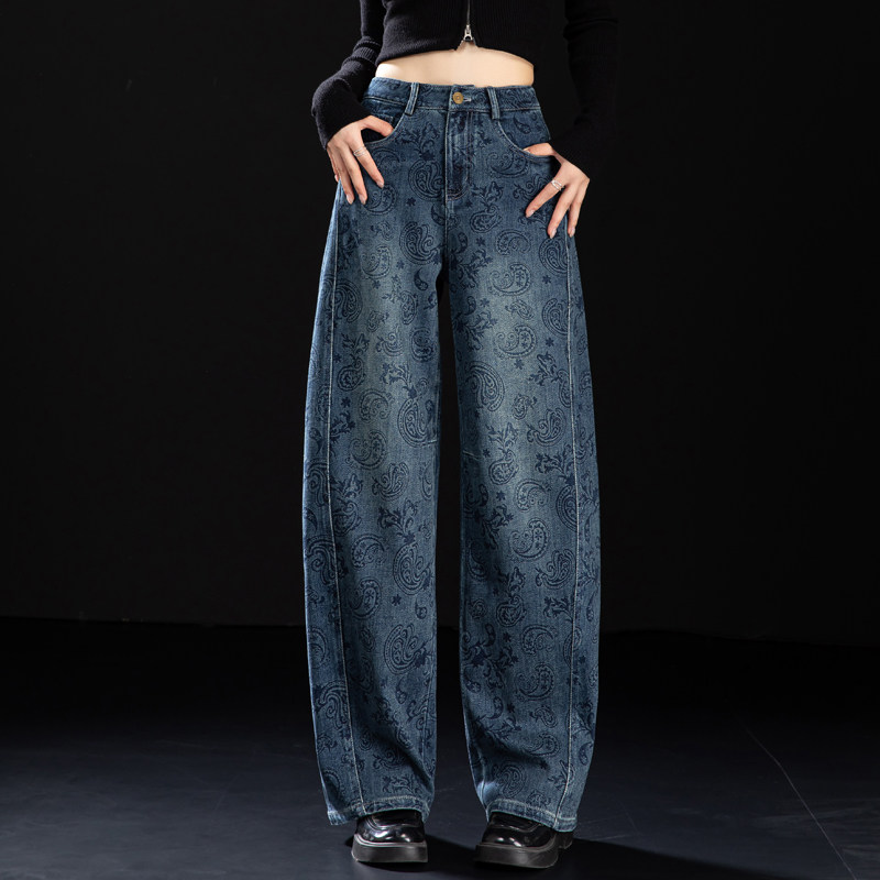 📚 腰果花印花牛仔裤女2026新款春秋季版型好看的裤子高腰宽松弯刀裤