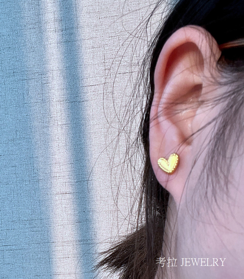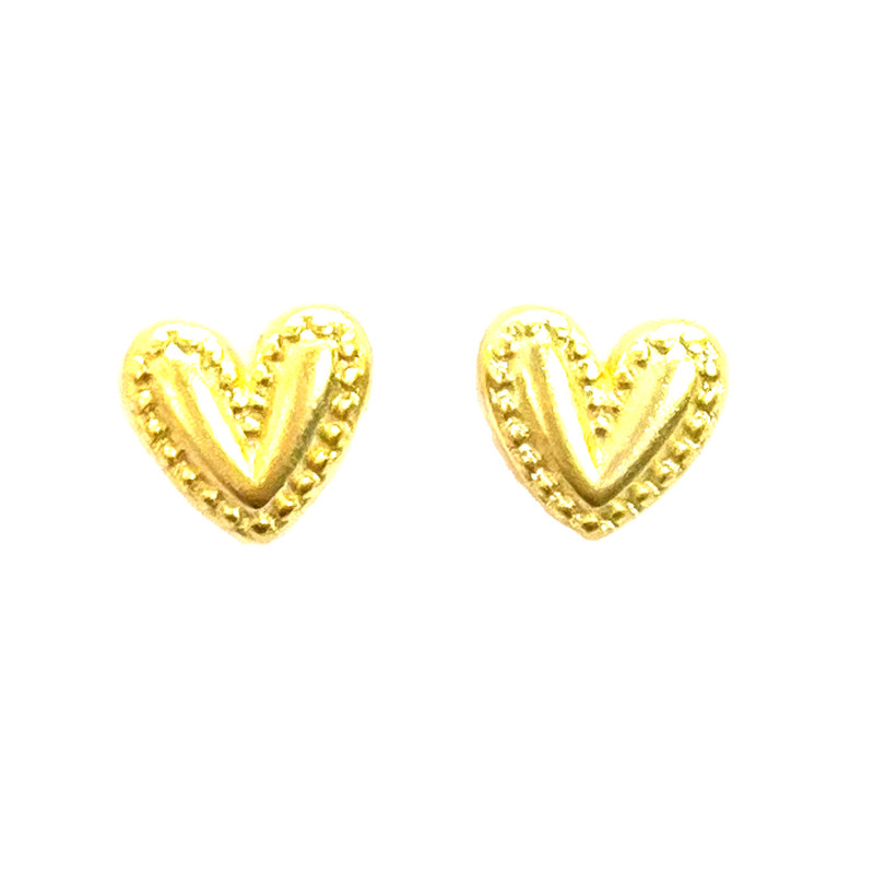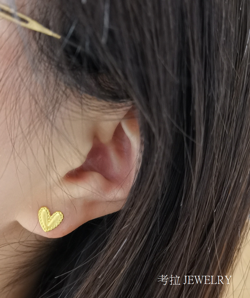 📚 古法金爱心耳钉女纯银镀黄金色18.K磨砂心形耳环耳饰简约个性豆豆
