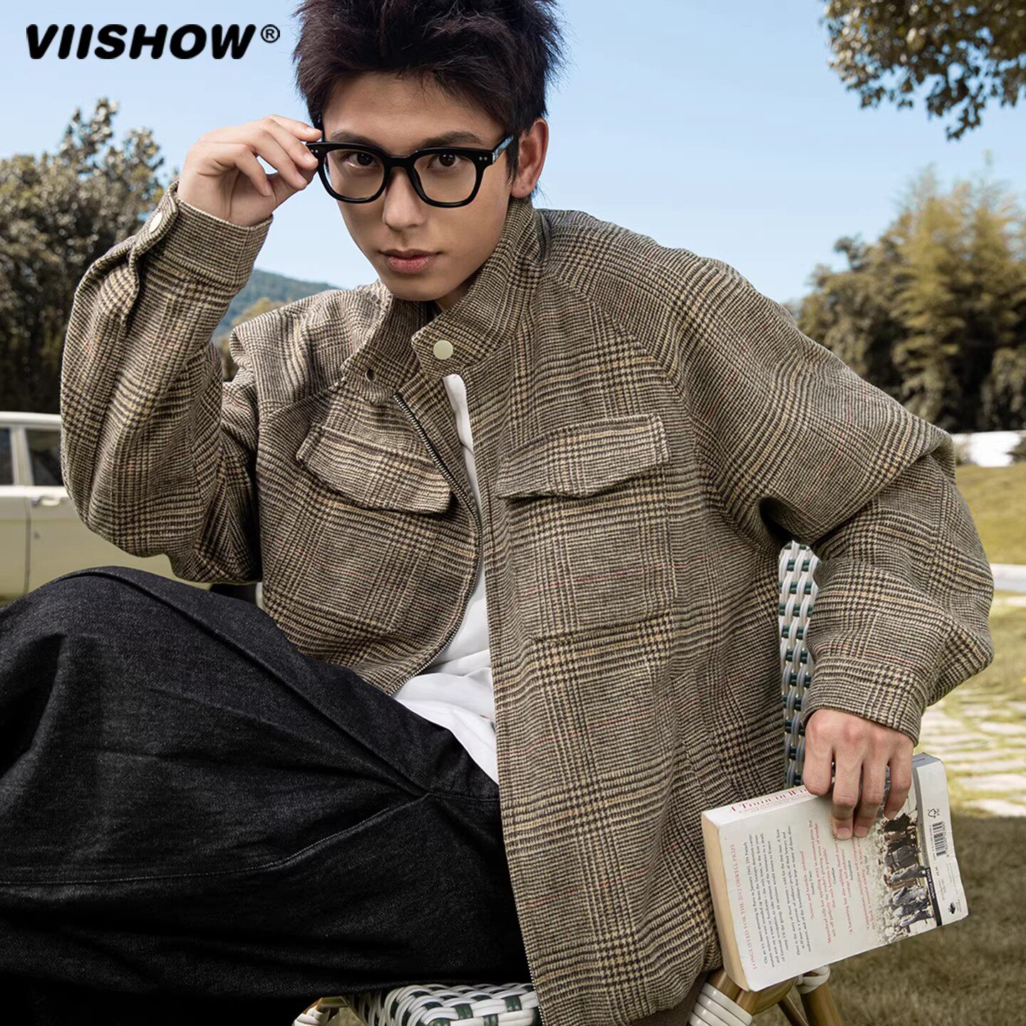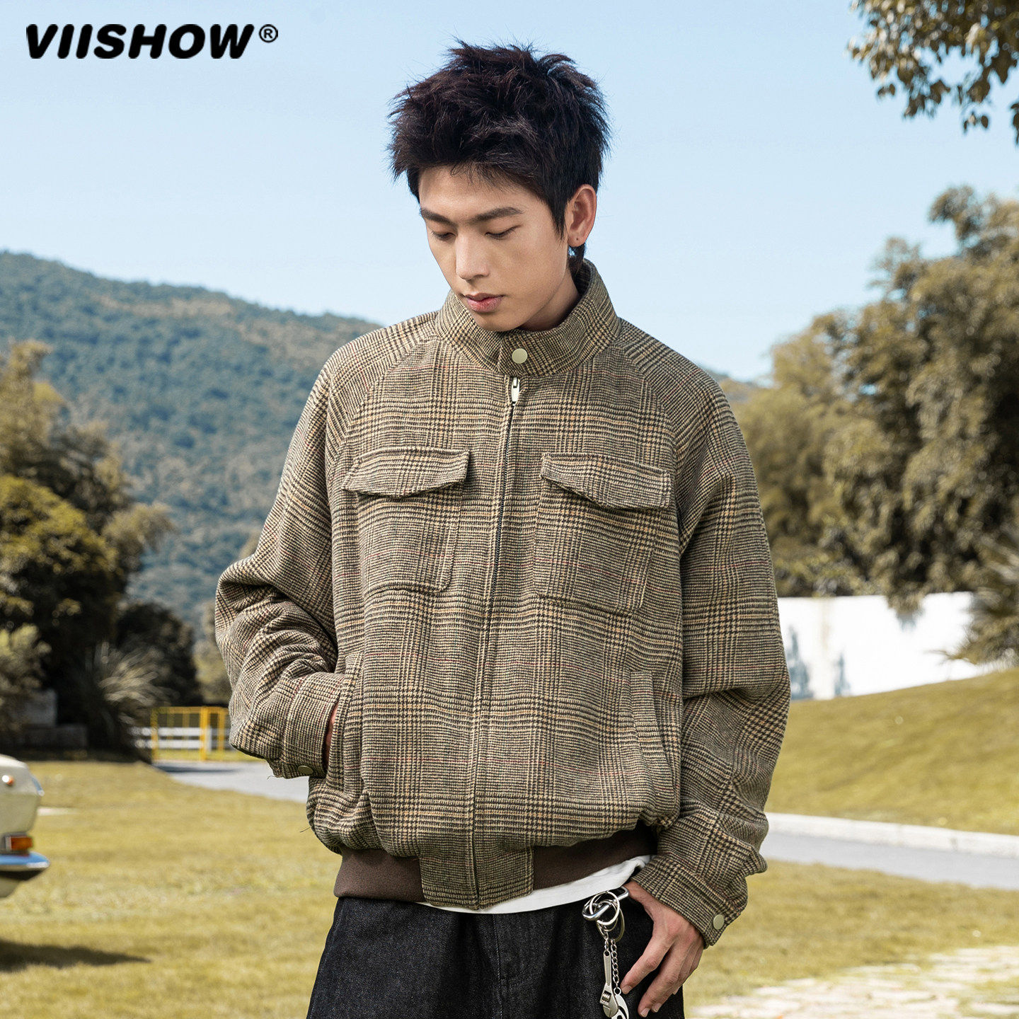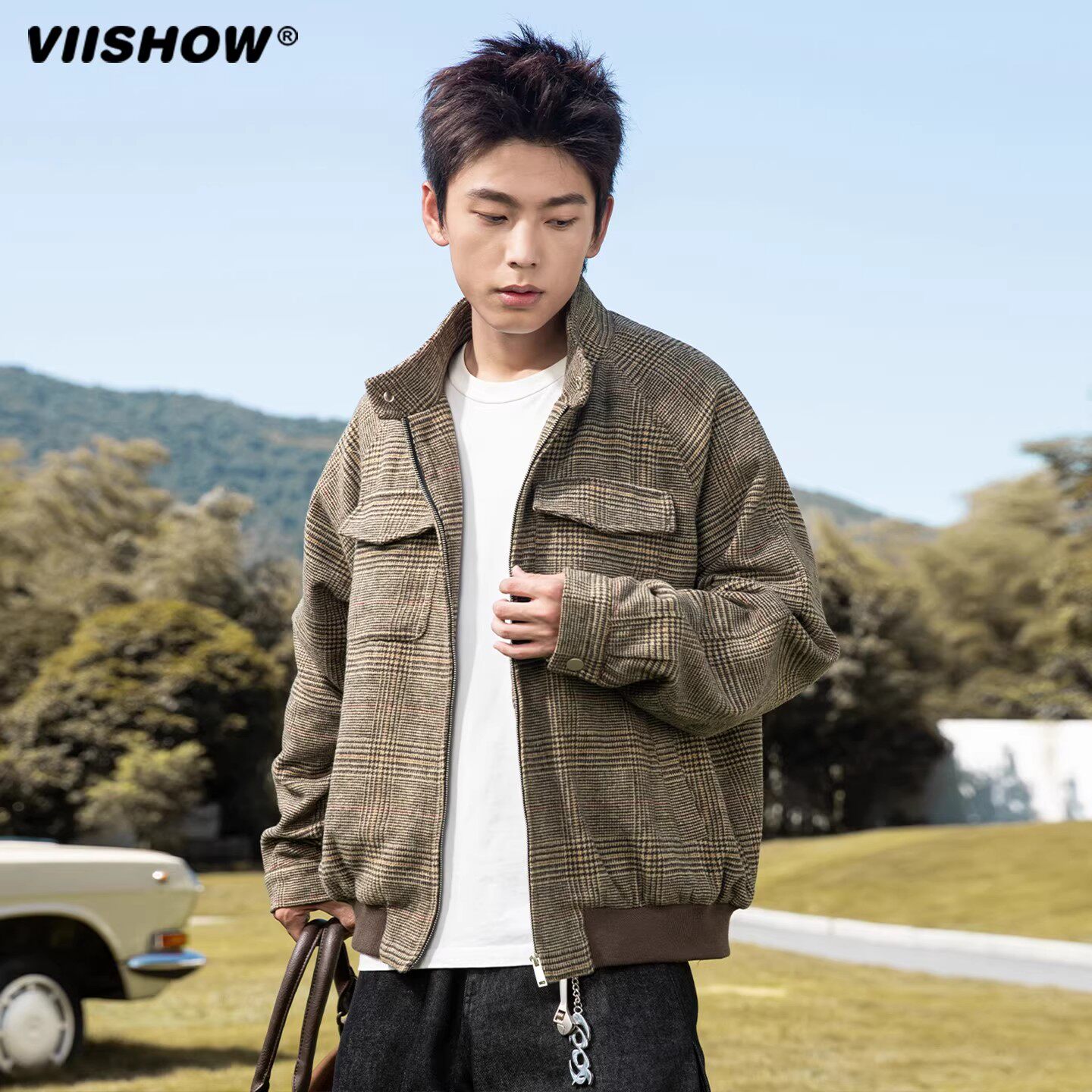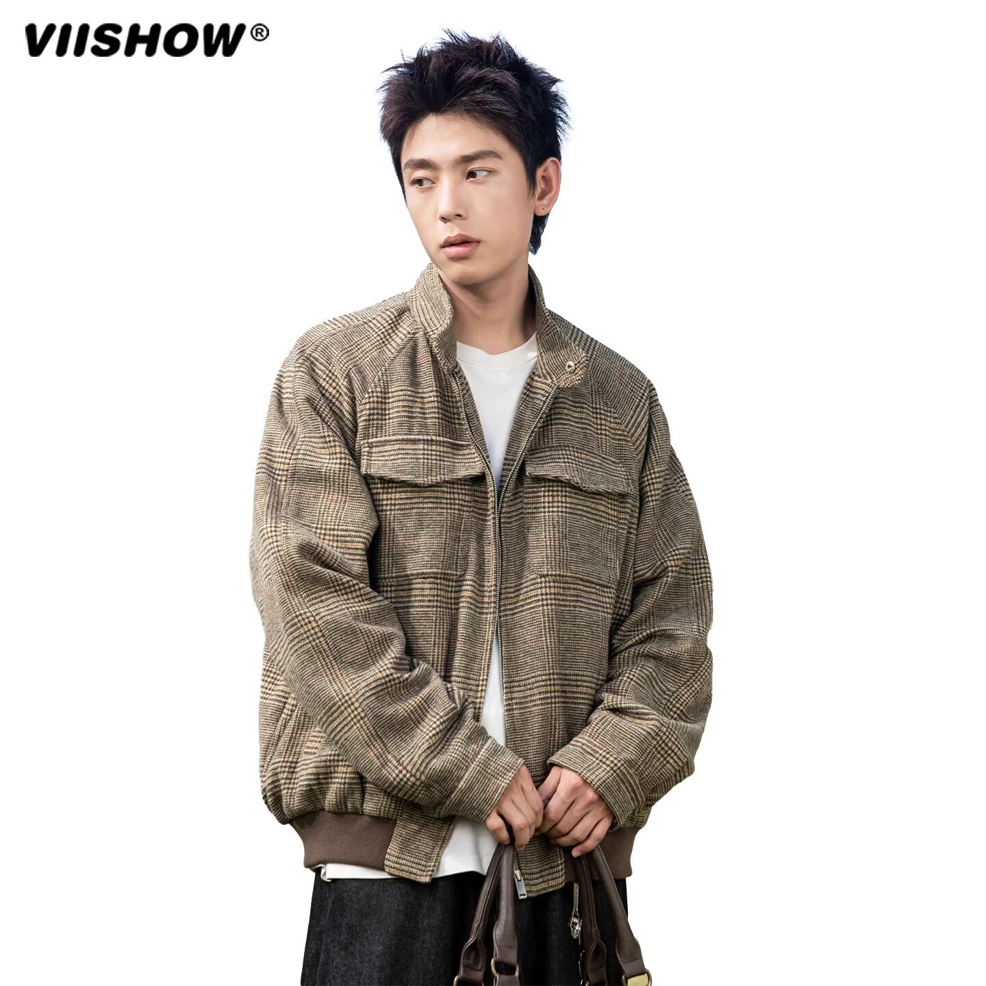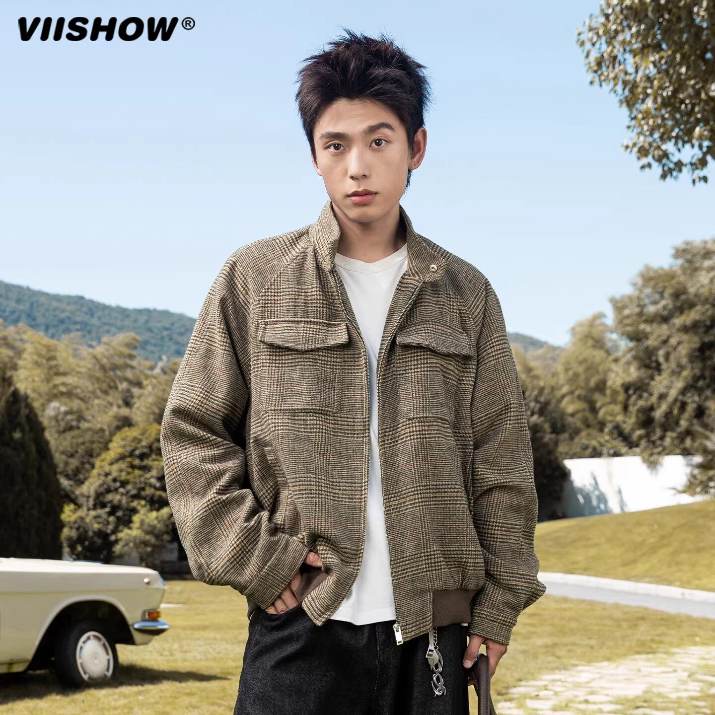 📚 VIISHOW美式复古千鸟格立领外套男款秋潮牌宽松休闲男哈灵顿夹克