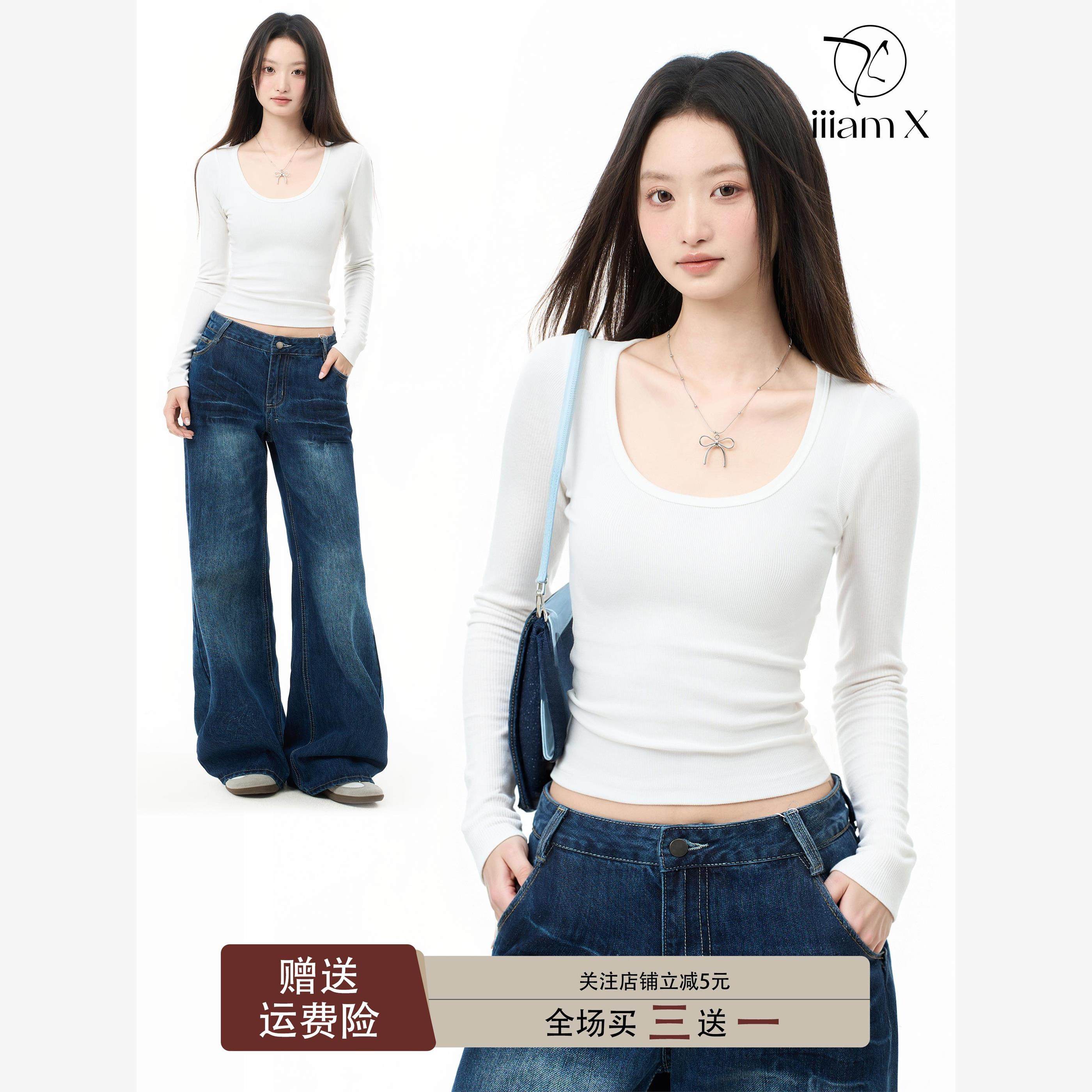 📚 iiiamX白色方领长袖上衣女秋季内搭打底衫修身正肩大领口t恤2025