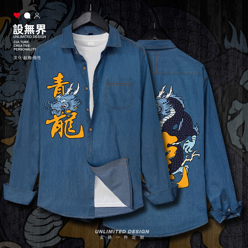 📚 设无界中国风传统街头手绘艺术插画二次元青龙牛仔衬衫男女衬衣