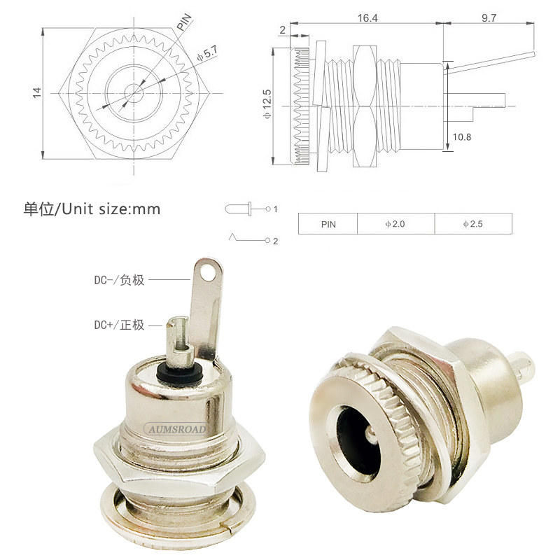 📚 DC5.5*2.1/2.5焊接DC母插座带螺丝公头带纯铜线面板安装099大功率