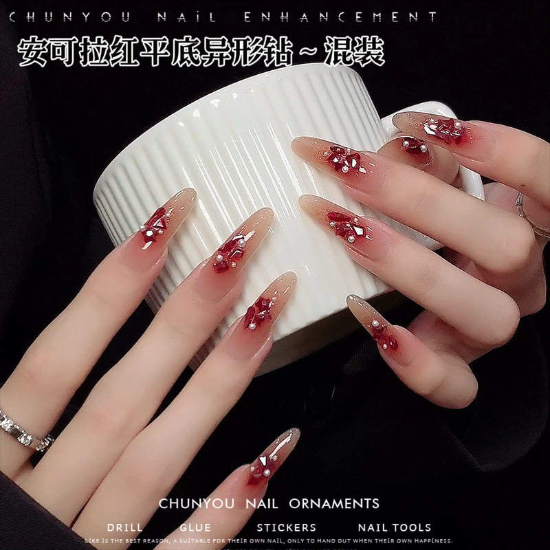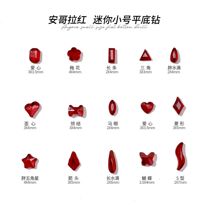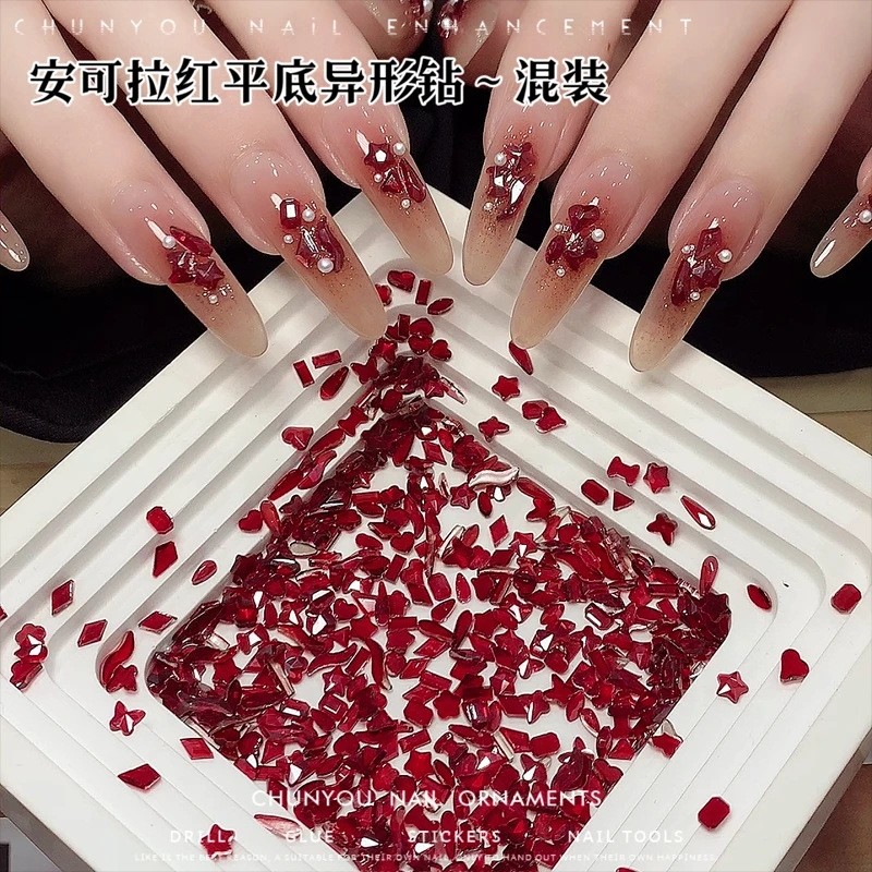 📚 秋冬流行安可拉红迷你小号平底异形钻混装超闪透底大红指甲装饰品