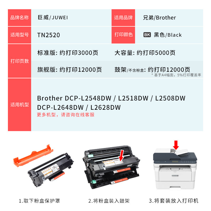 📚 适用兄弟DCP-L2648DW L2628DW打印机硒鼓DCP-L2548DW L2518DW L2508DW碳粉盒扫描一体机TN2520粉盒DR2520鼓架
