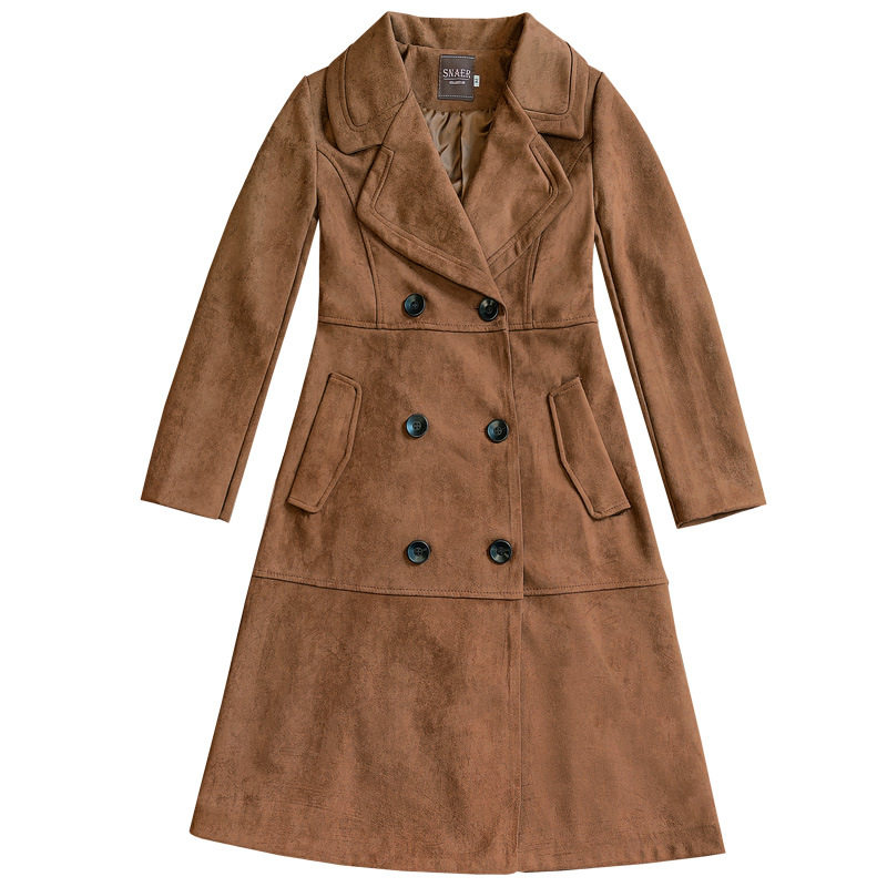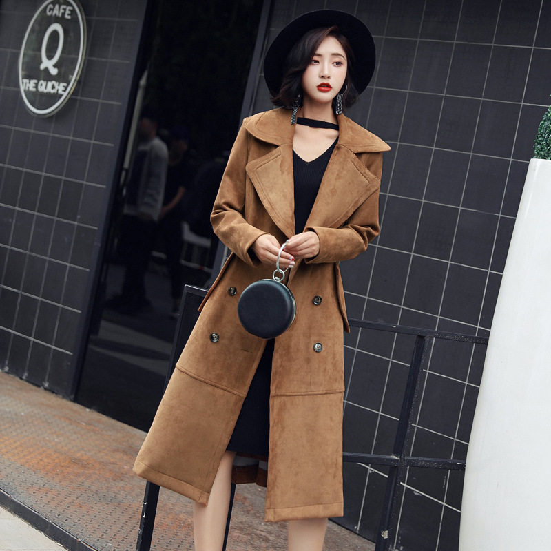 📚 秋冬韩版麂皮绒外套中长款双排扣风衣罗子君同款魅力系带大衣外套