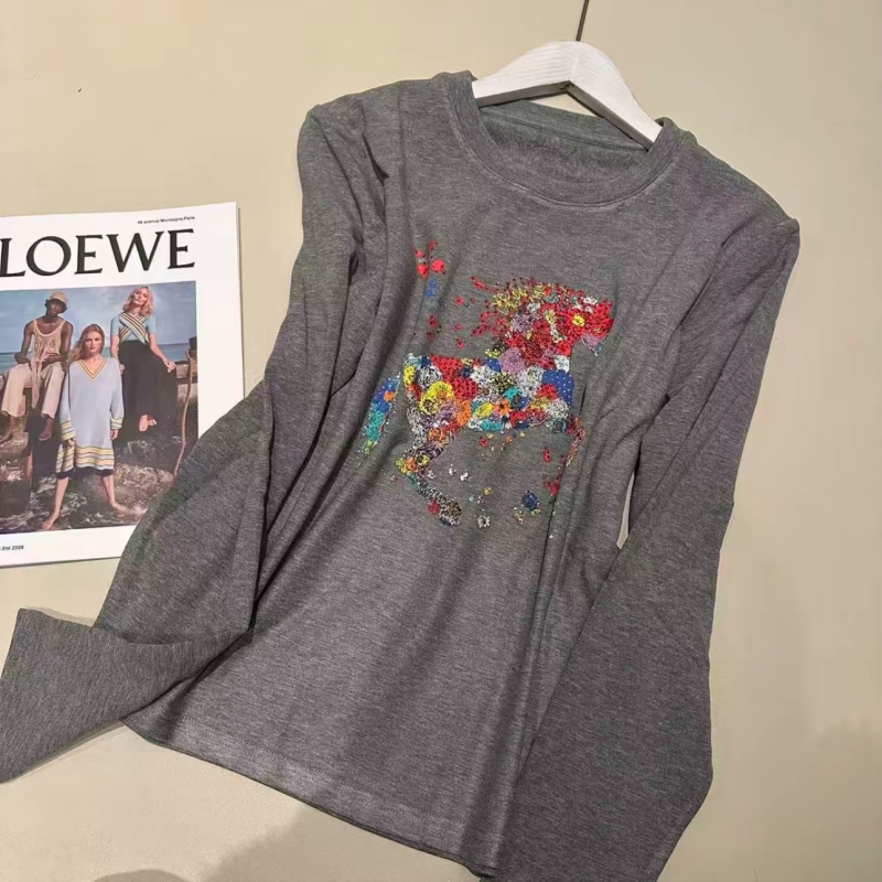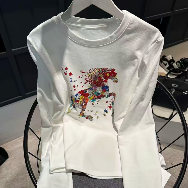 📚 马到成功彩色马图案长袖T恤2025冬季新款圆领设计感减龄显瘦上衣