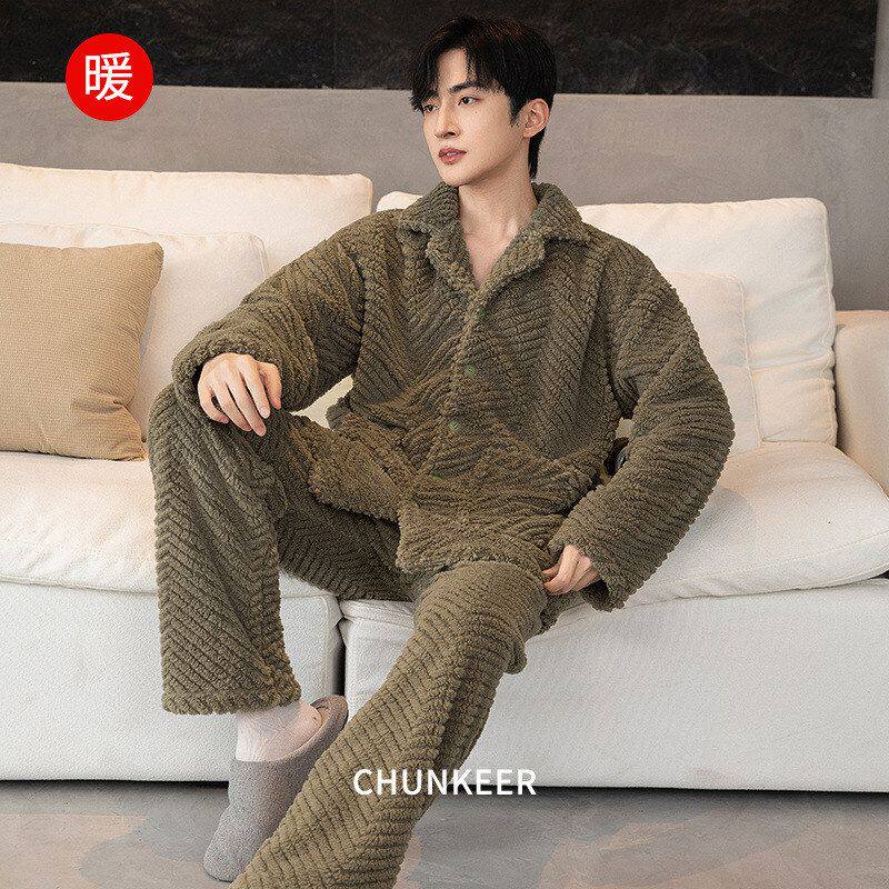 📚 琳芯若梦男款翻领休闲睡衣冬季新款长毛绒提花家居服套装保暖绒可