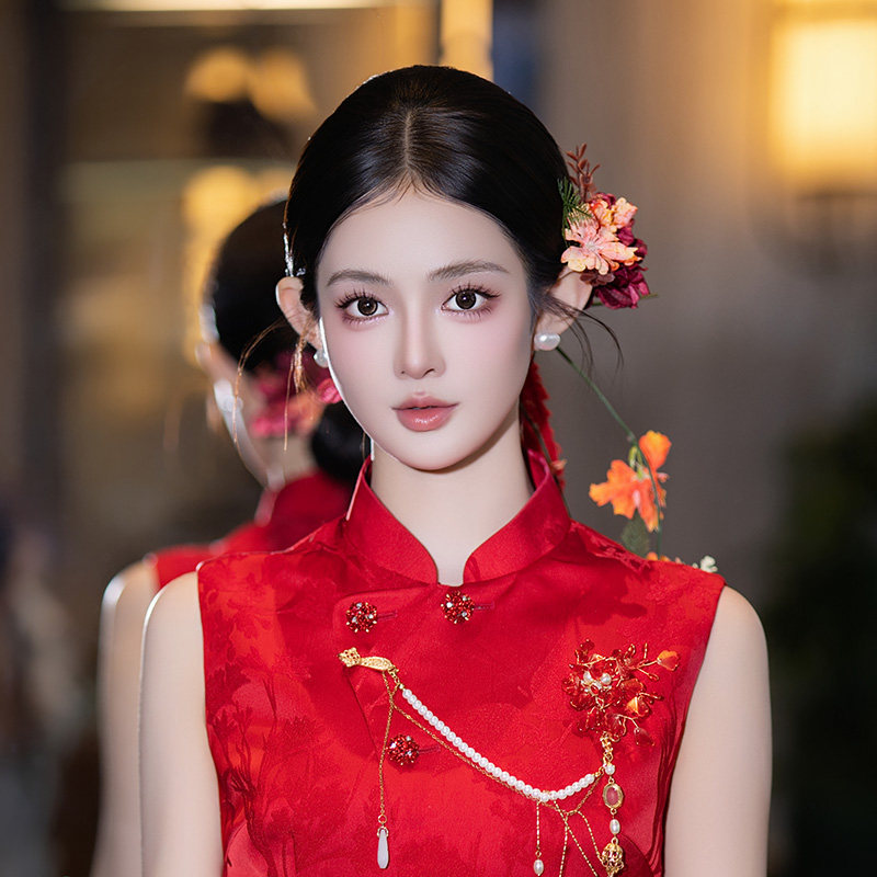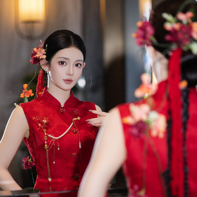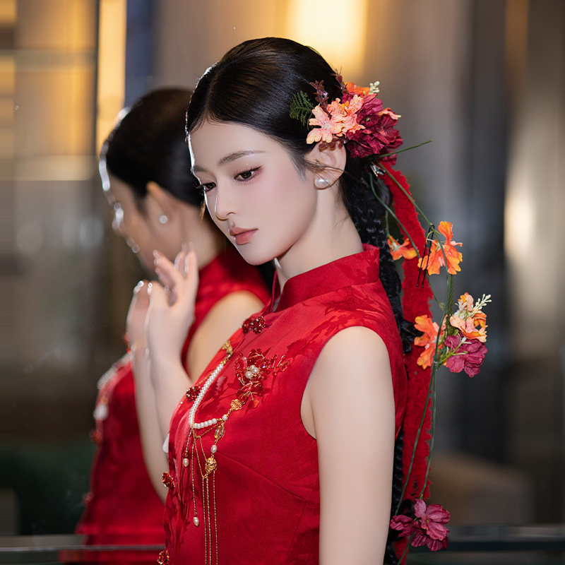 📚 新中式新娘发饰手工花朵长条绒线红色系发夹国风礼服旗袍裙头饰品