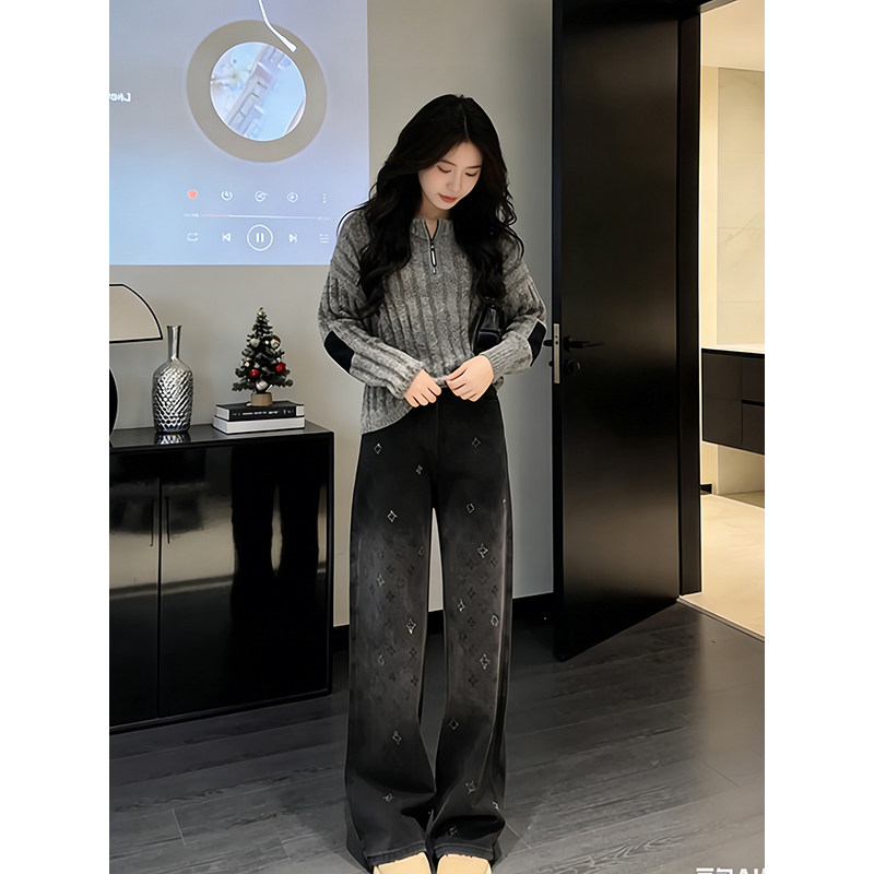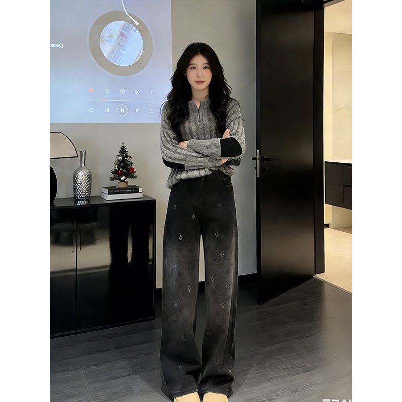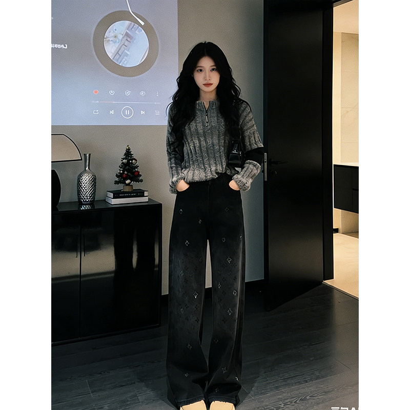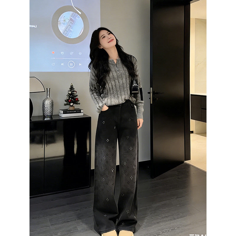 📚 时尚亮片设计感黑色阔腿牛仔裤女2026加绒冬季高腰印花显瘦阔腿裤