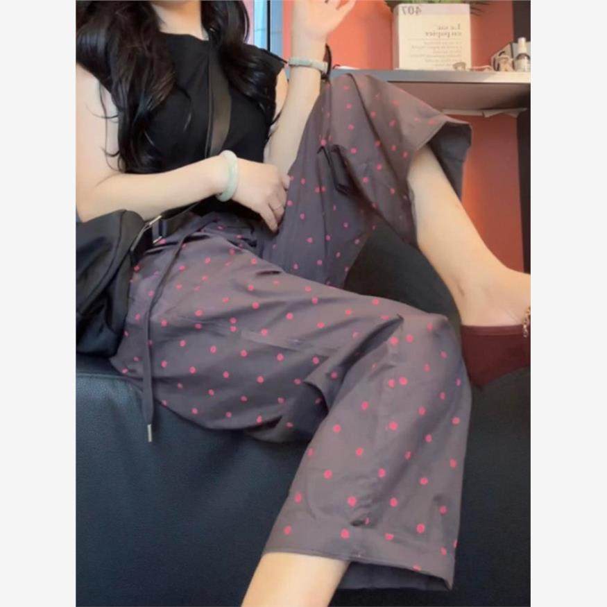 📚 韩国冰丝波点阔腿裤子女夏季宽松大码小个子休闲直筒速干裤运动裤