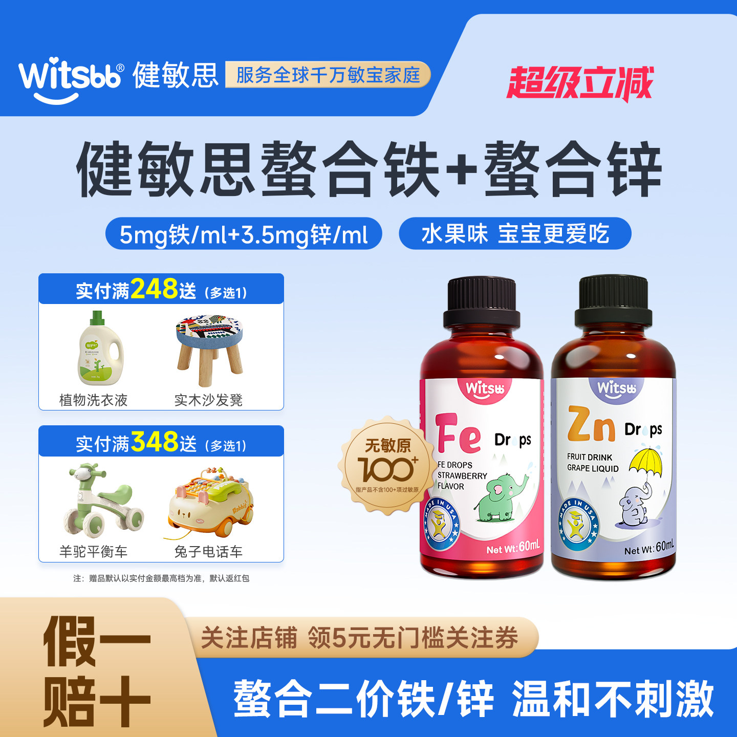 📚 witsbb健敏思螯合铁螯合锌滴剂60ml无敏原100+宝宝儿童送婴儿食谱