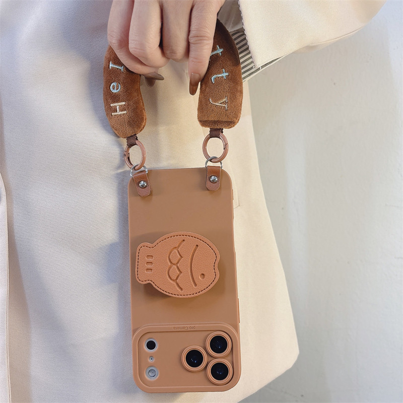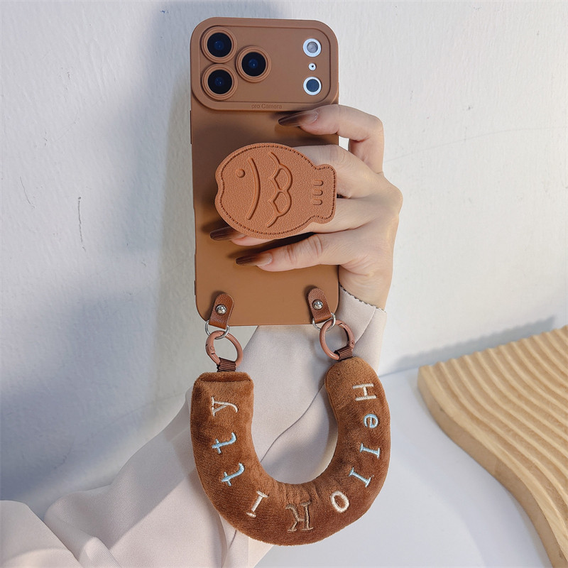 📚 棕色毛绒腕带小鱼支架适用小米17/15/14/13手机壳pro高级感红米note15R/12/11斜跨K70女K60挂绳K50保护套新款