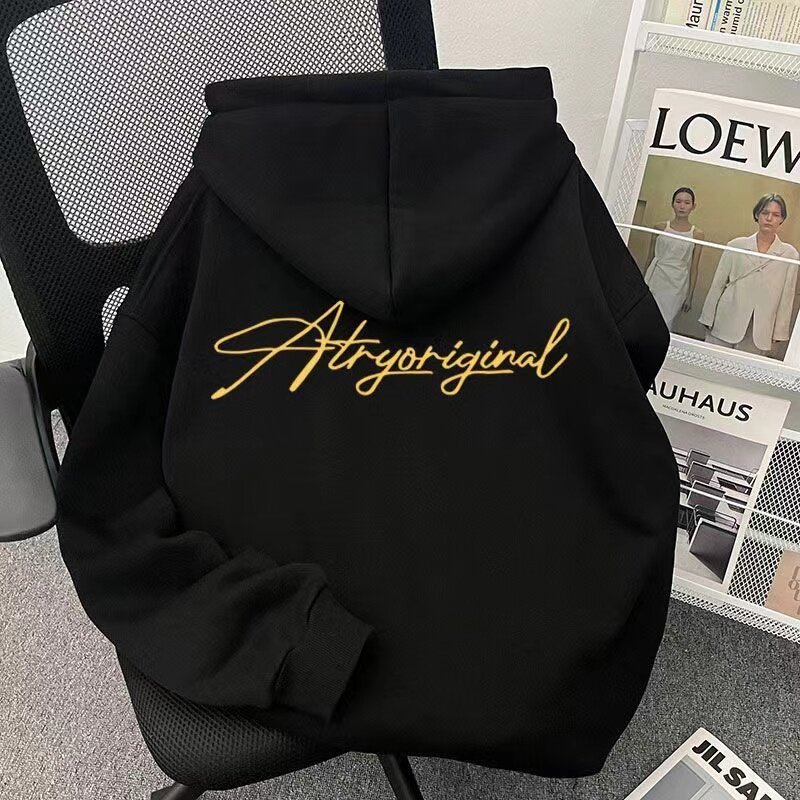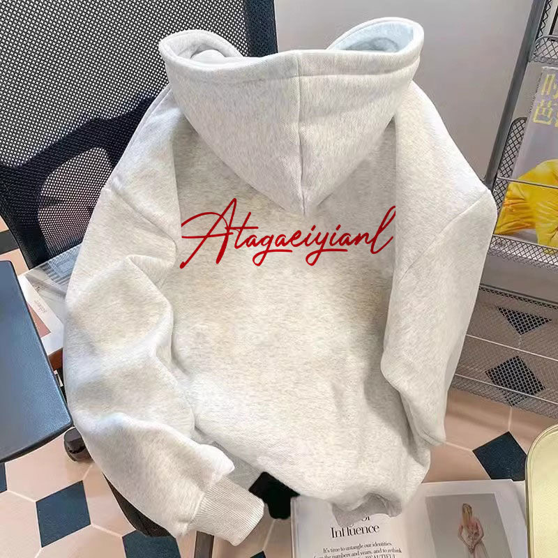 📚 美式潮牌vintage卫衣男女复古字母秋冬款藏青色连帽加绒加厚外套