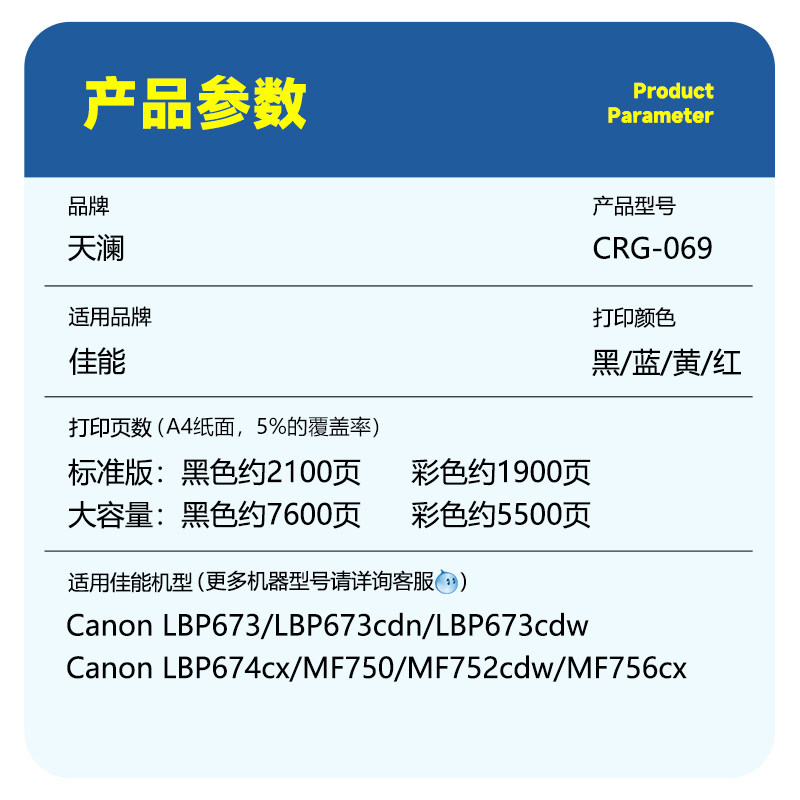 📚 天澜适用佳能crg069硒鼓LBP673CDN LBP673CDW LBP674CX打印机墨盒MF752CDW MF756CX粉盒MF750 MF754CDW碳粉盒