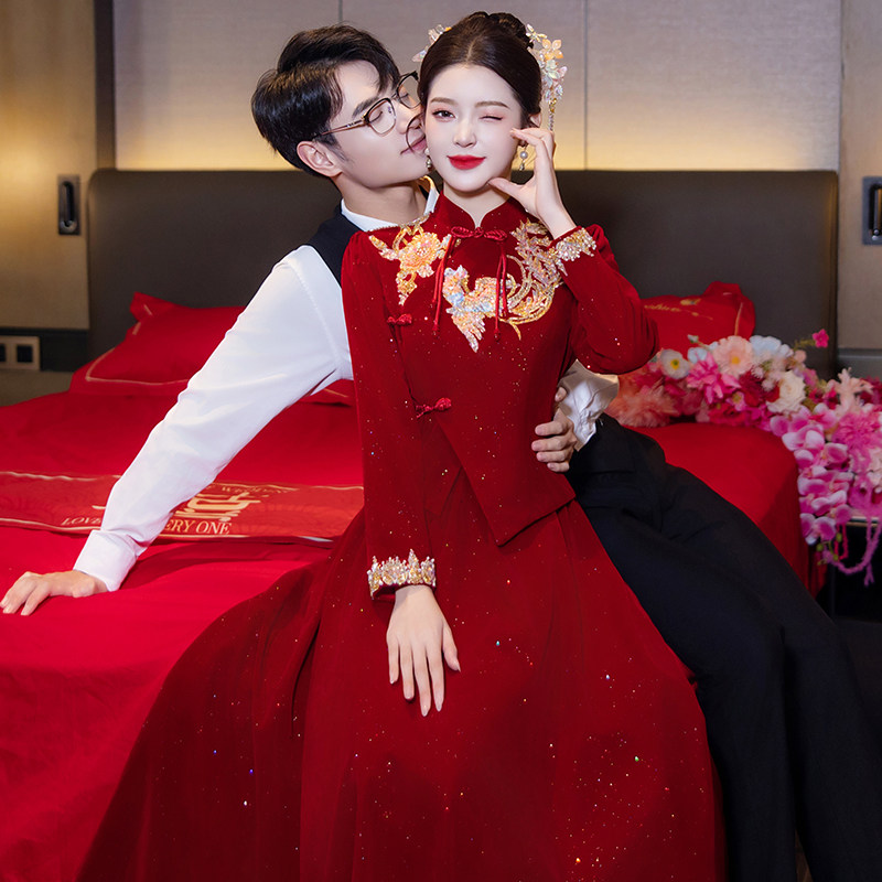 📚 敬酒服新娘2025新款订婚礼服裙女酒红色高级感新中式结婚衣服冬季