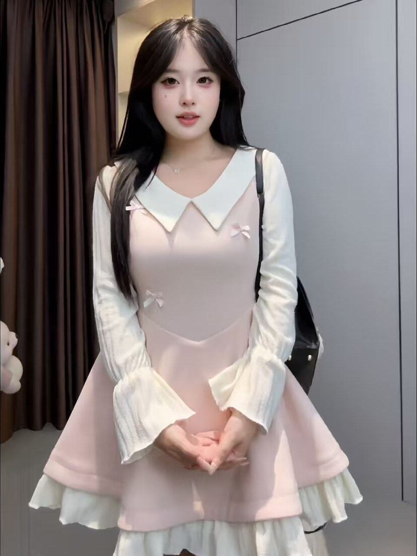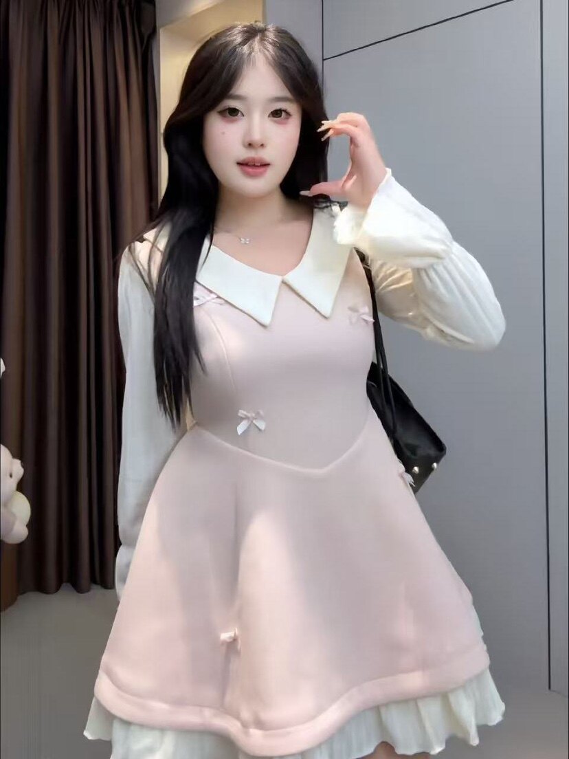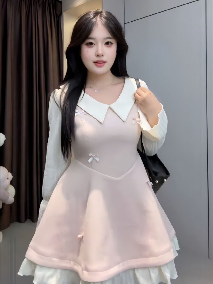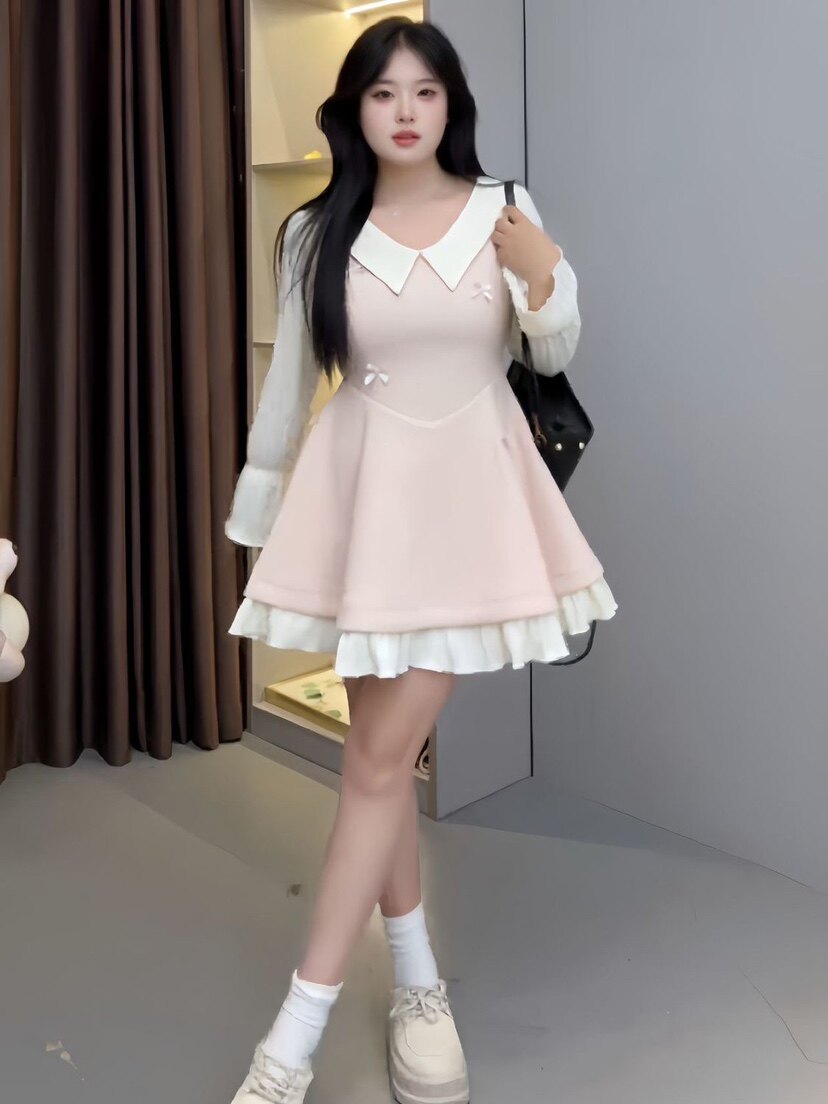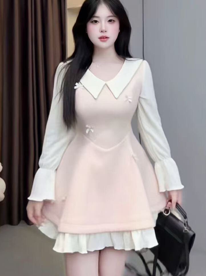 📚 大码胖mm【云端恋曲】秋冬新款娃娃领长袖连衣裙收腰遮肉褶边短裙
