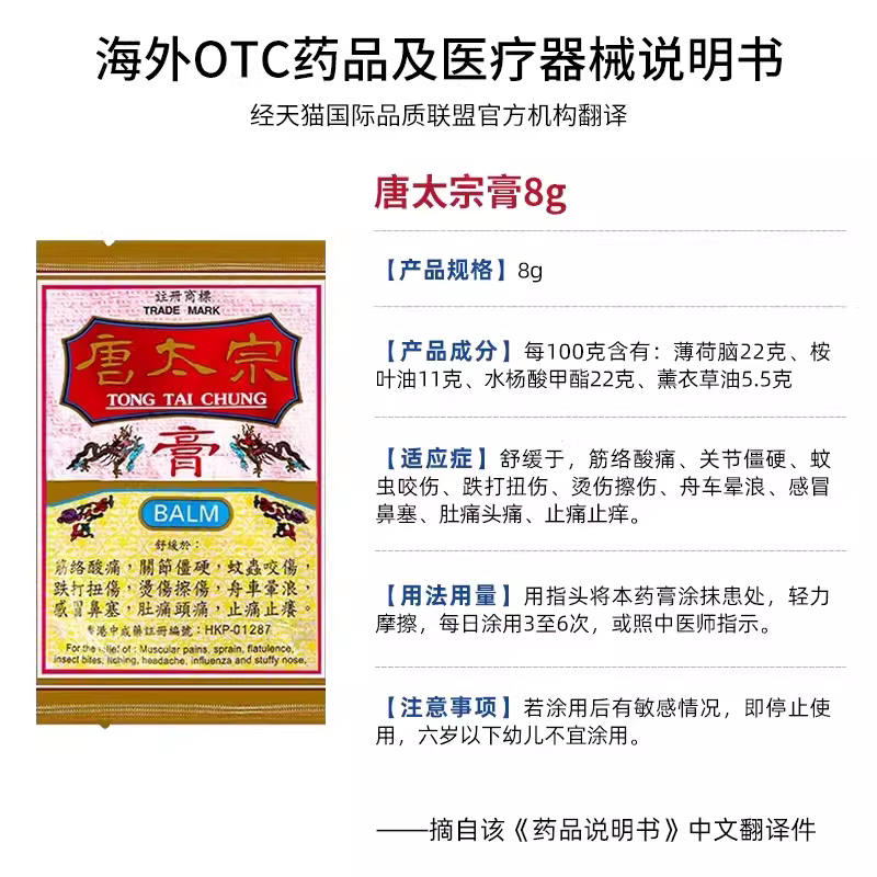📚 香港唐太宗膏8g关节跌打扭伤止痛膏烫伤擦伤蚊虫叮咬止痒膏药正品