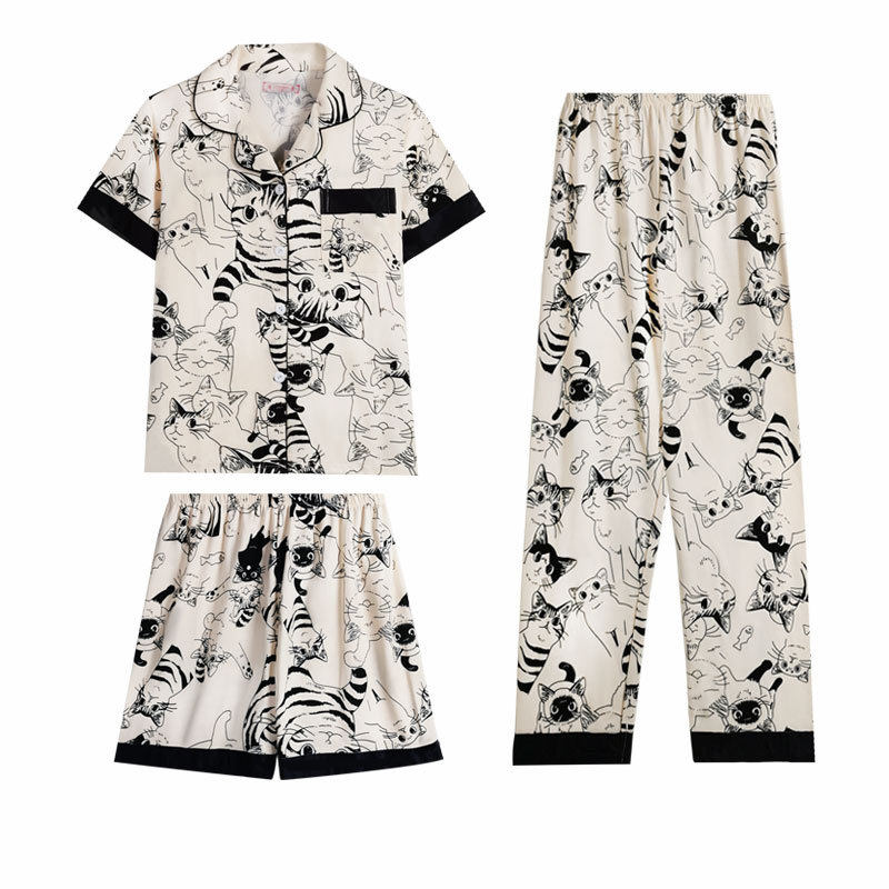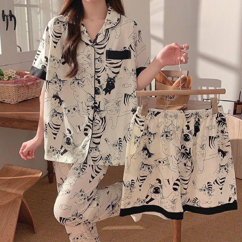 📚 夏季150CM矮小个子睡衣卡通小猫开衫短袖长裤装慵懒家居服套装xxs