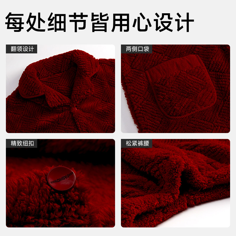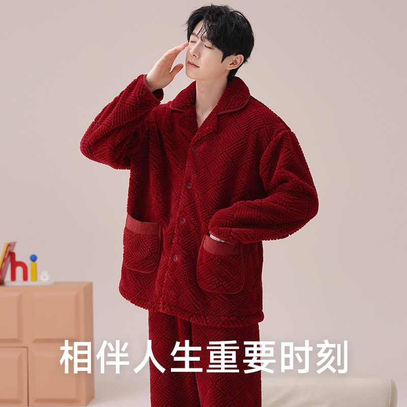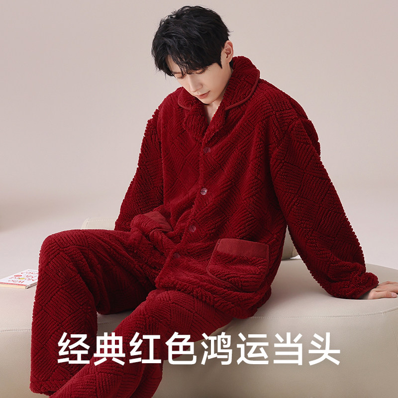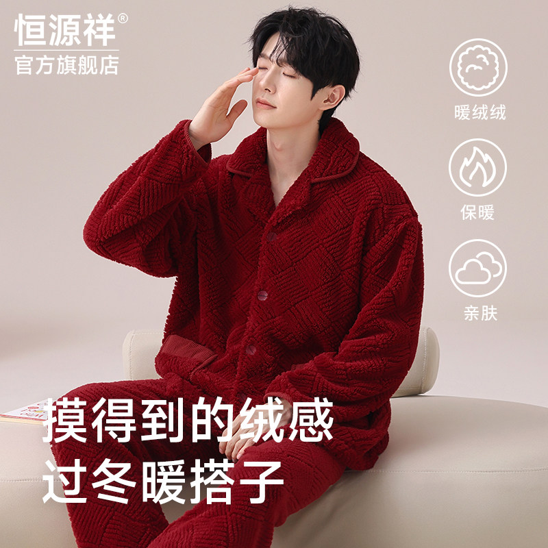 📚 恒源祥男冬季加绒加厚珊瑚绒睡衣本命年大红色马年保暖家居服套装