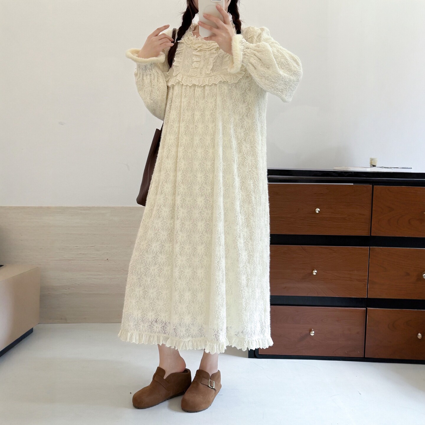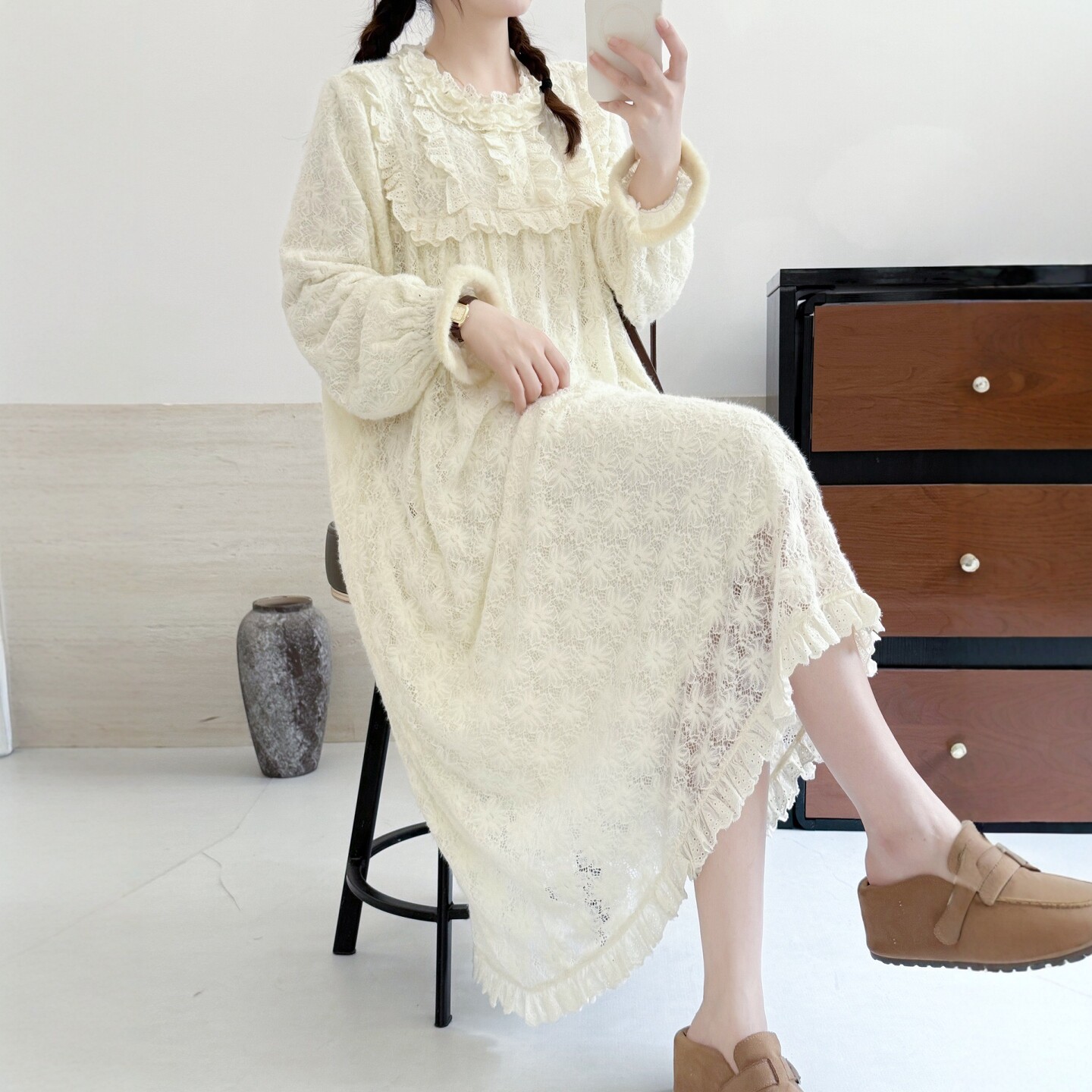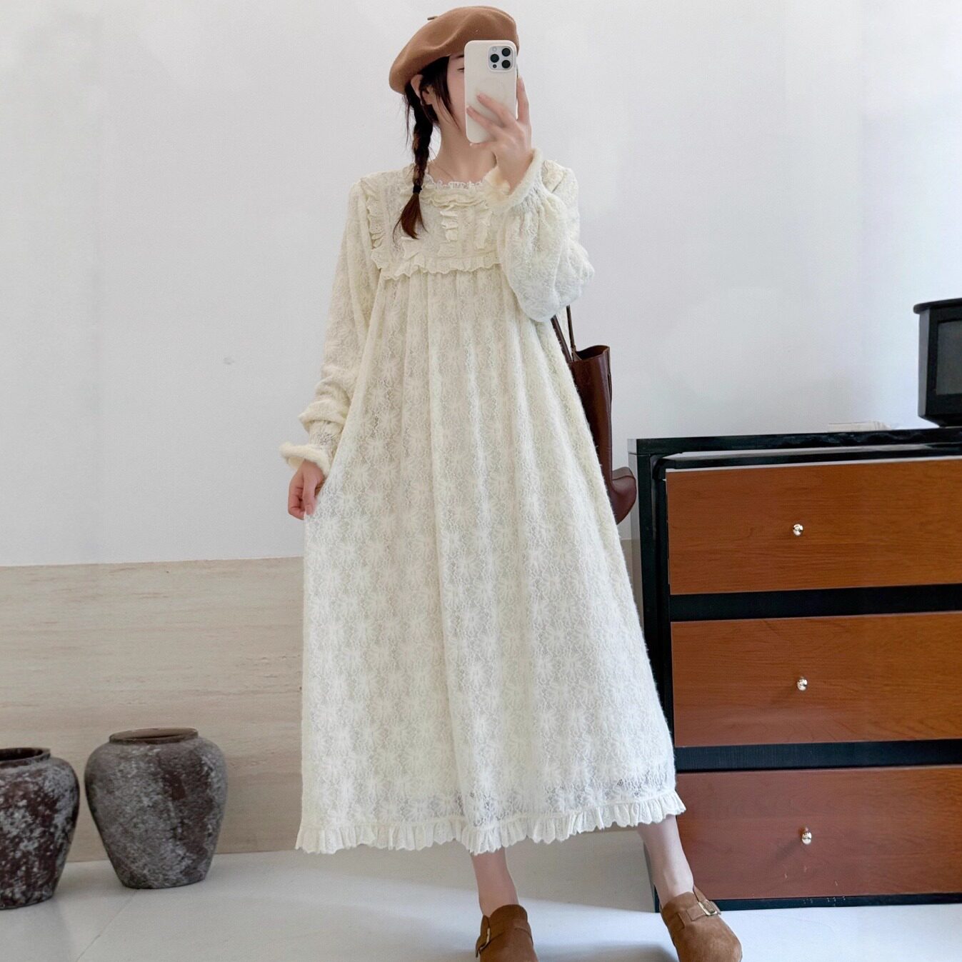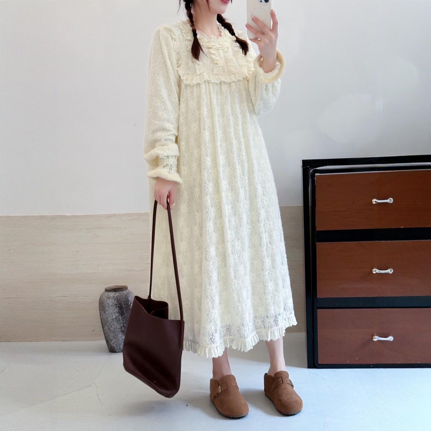 📚 秋冬新森系公主风软糯蕾丝加绒长袖连衣裙花边拼接公主裙内搭长裙