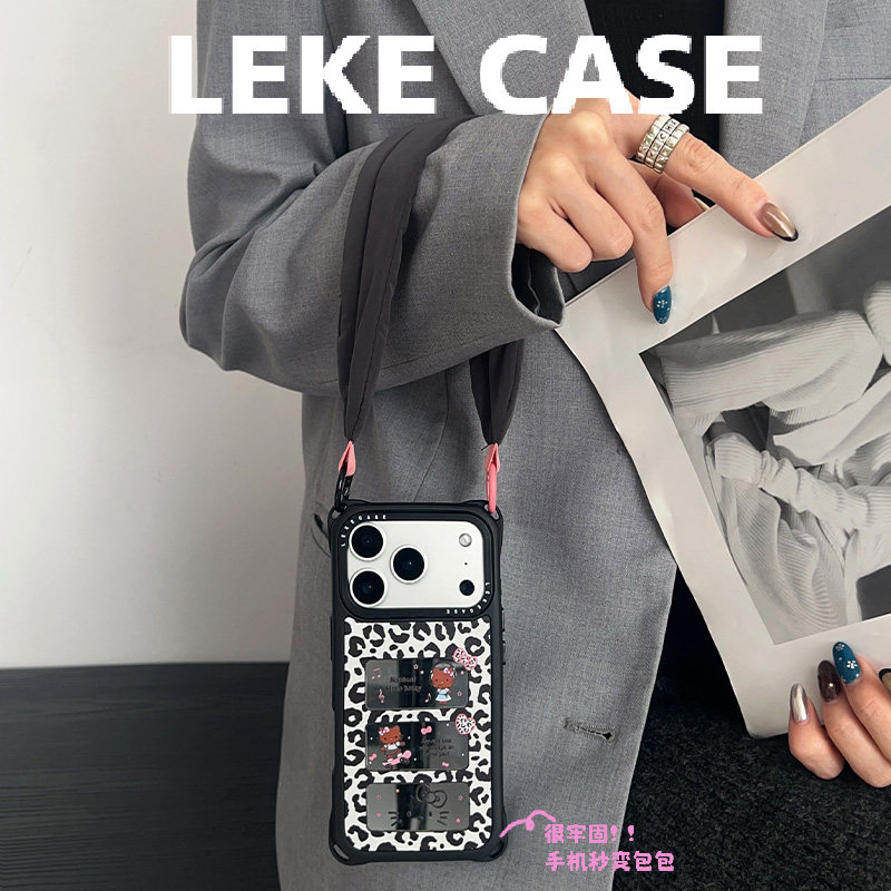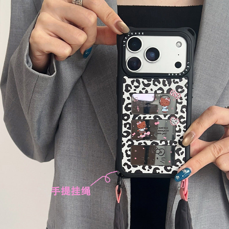 📚 甜酷风豹纹猫镜面~适用iphone17手机壳带挂绳15手腕苹果16promax四角防摔13手提小米14包包12带子短款pura80