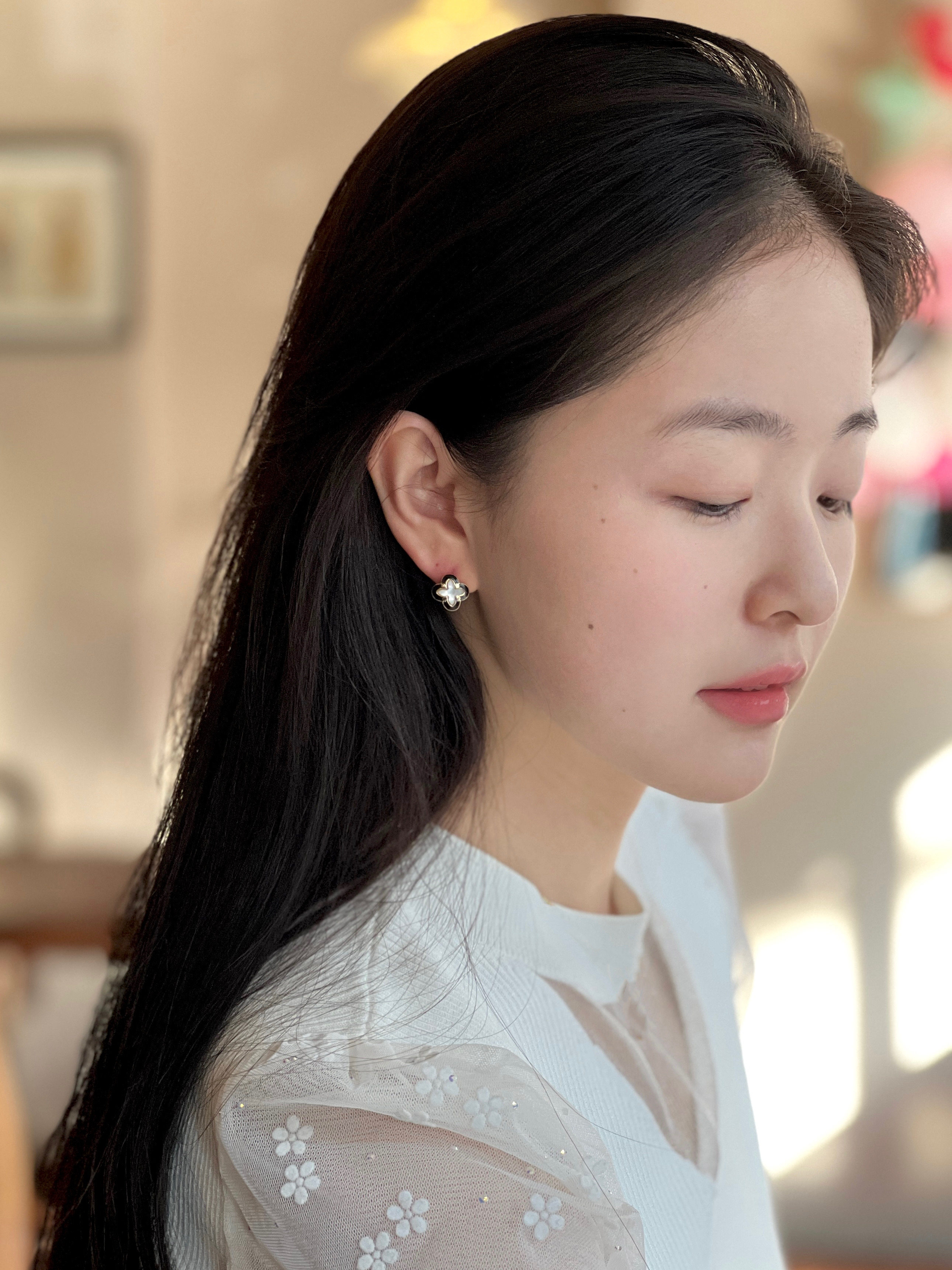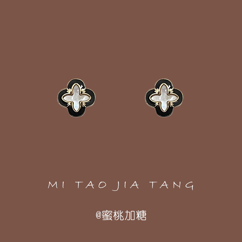 📚 蜜桃加糖/旧梦巴黎 设计感简约花瓣耳环黑色系气质母贝镶嵌耳钉