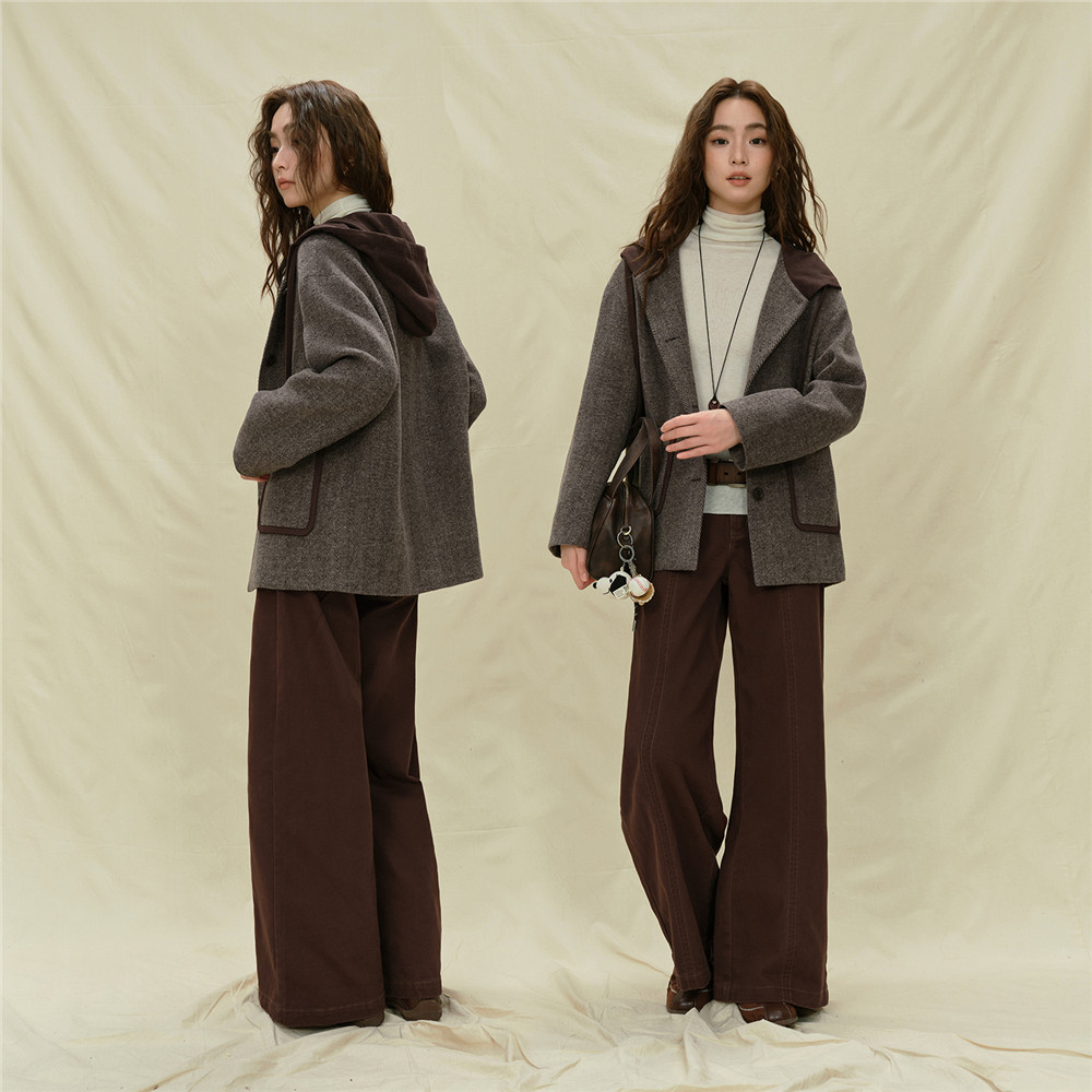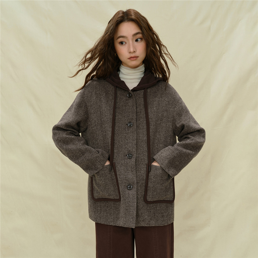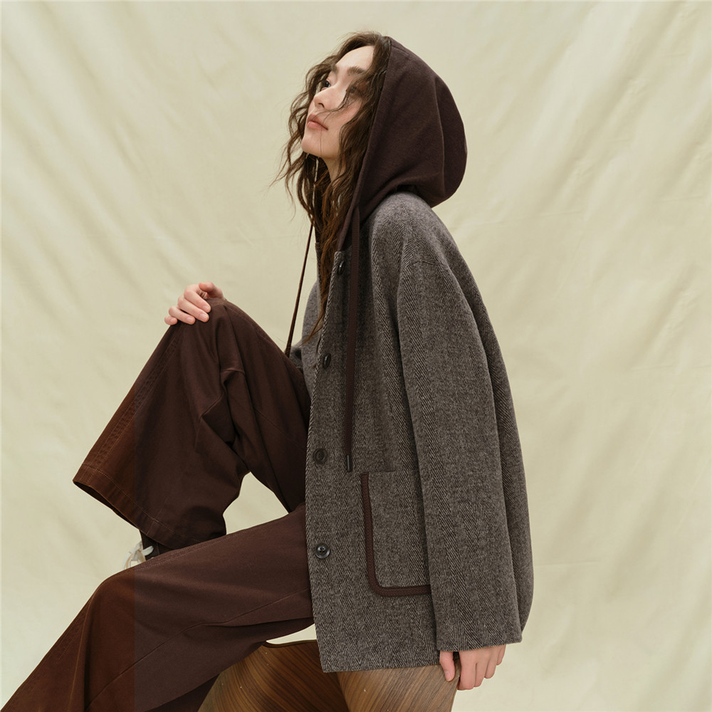📚 设计师款佐丹奴毛呢外套女装新款假两件拼色宽松连帽夹克18375715