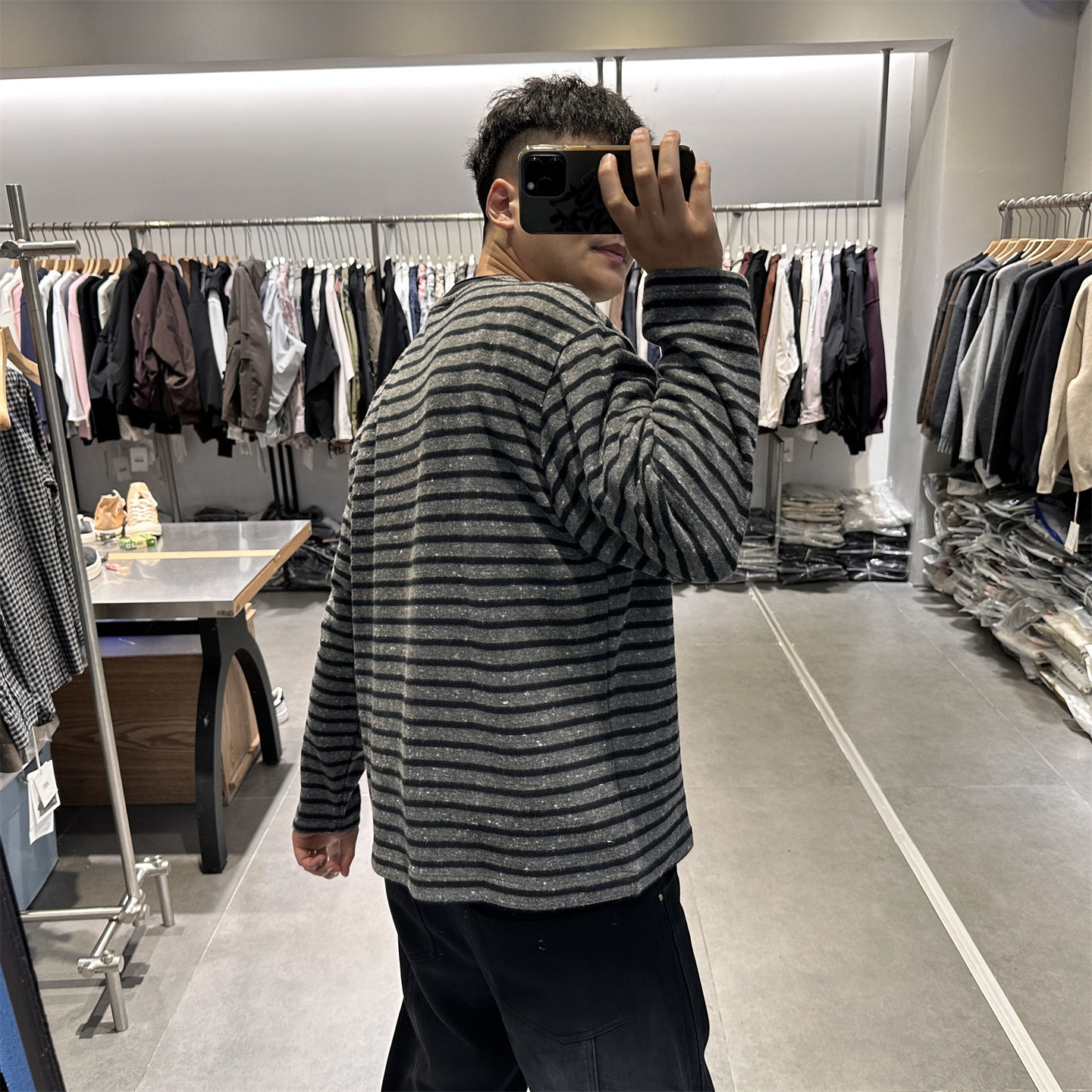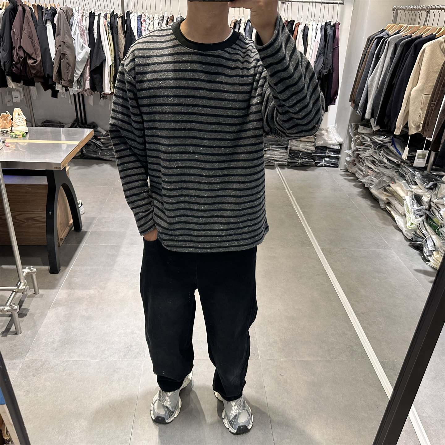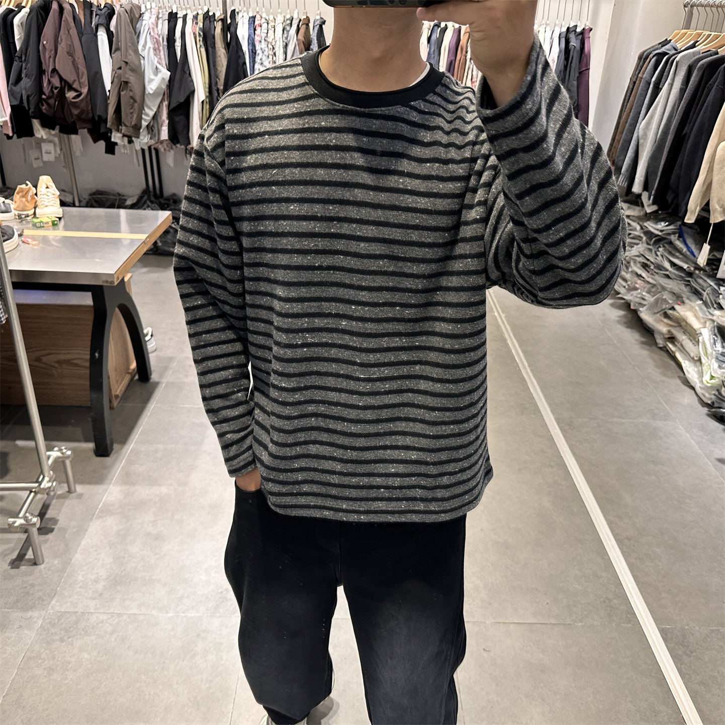 📚 2025秋季极简cleanfit黑色条纹圆领长袖T恤男套头日系宽松卫衣潮
