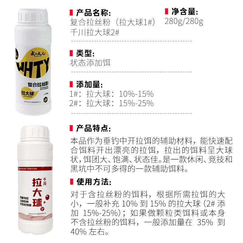 📚 武汉天元复合拉丝粉拉大球2号280g瓶装 粉末状态添加剂强拉力鱼饵