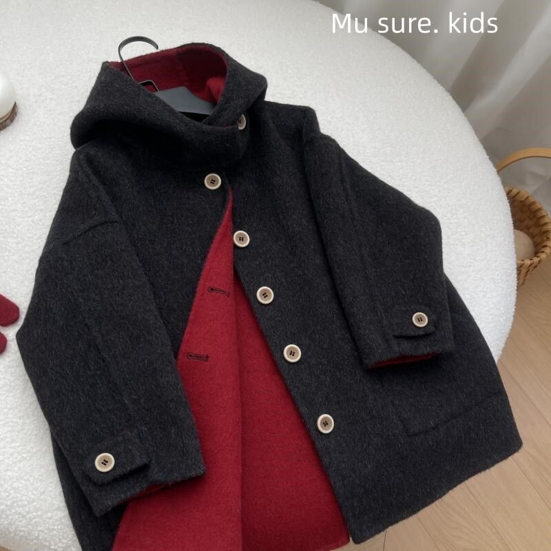📚 黑红连帽青少年秋冬男童女童双面羊绒大衣羊毛呢中长款亲子款外套