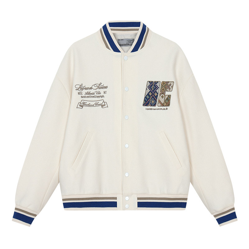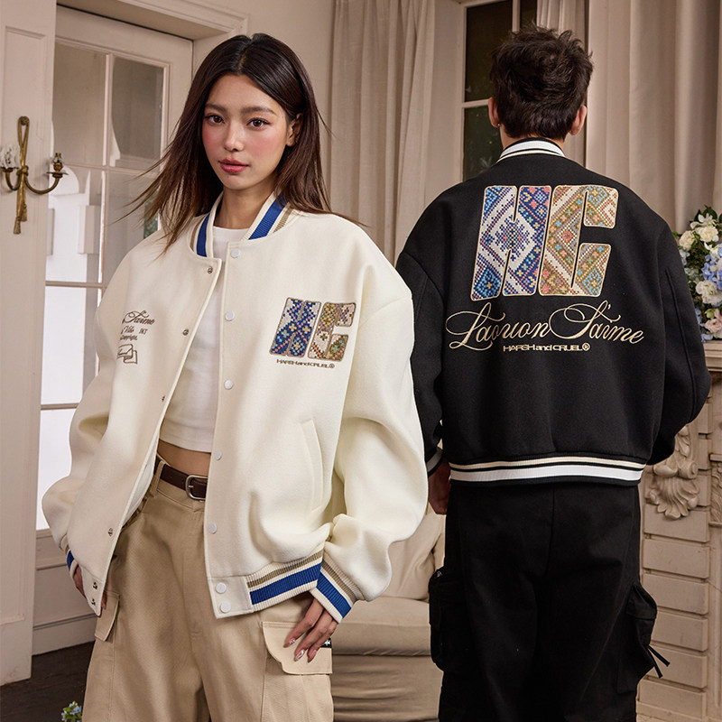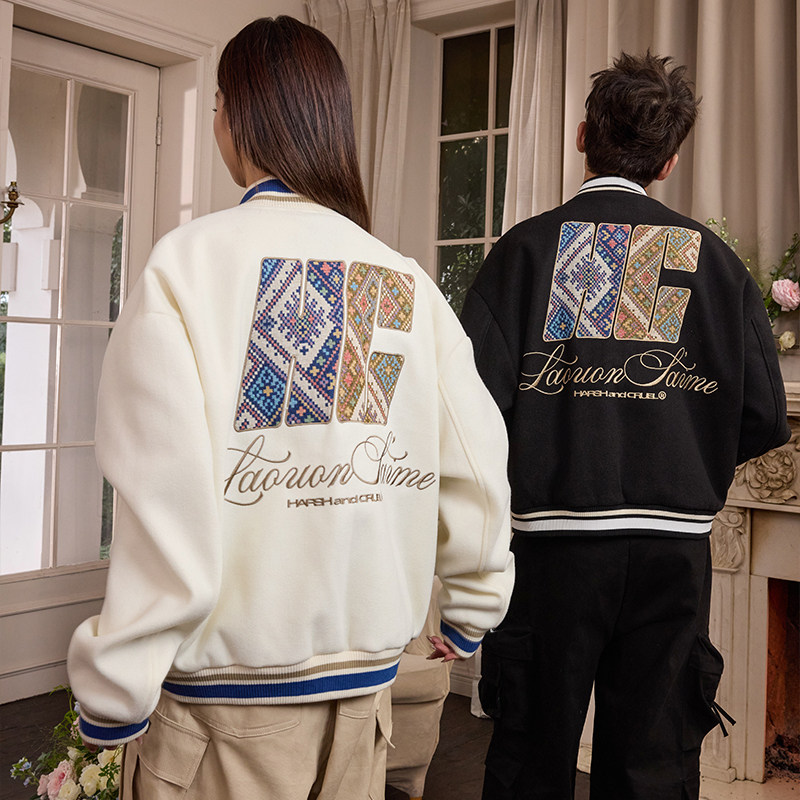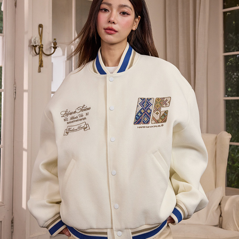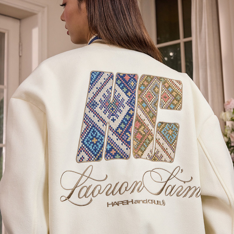 📚 harshandcruel民族风手写体学院感编织面料贴布绣棒球服外套