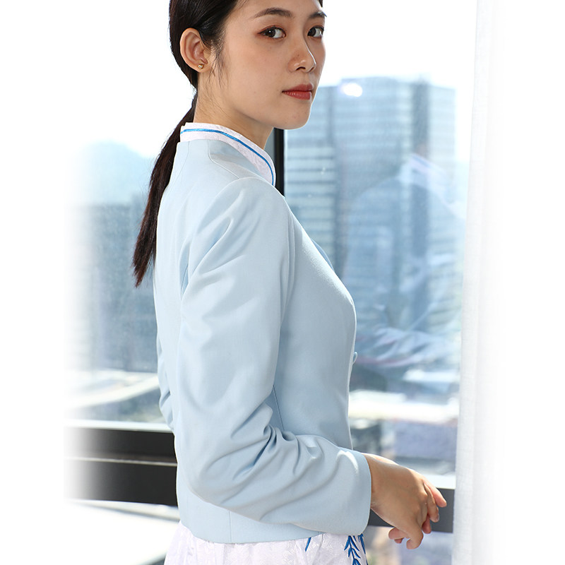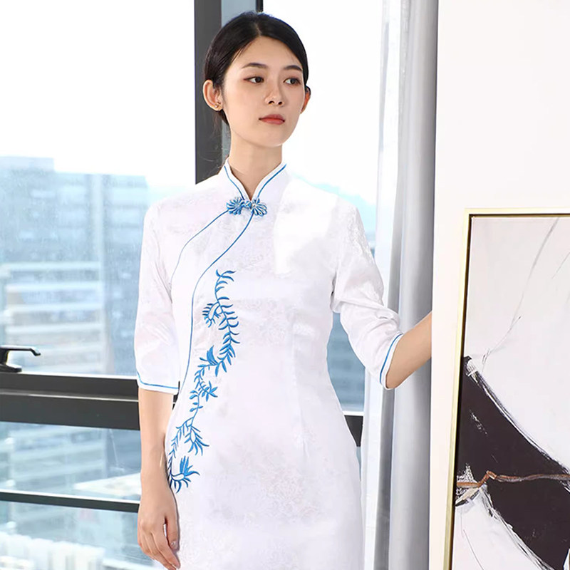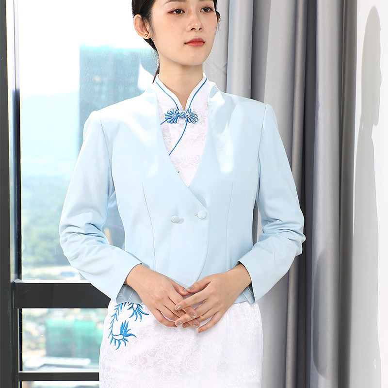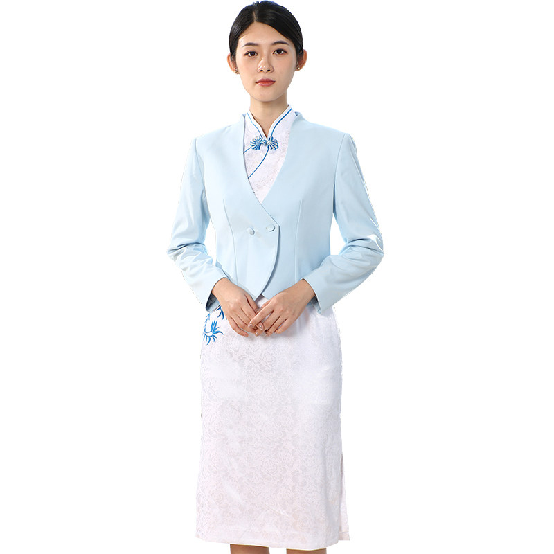 📚 空姐旗袍改良版连衣裙新中式工装青花酒店前台接待售楼茶馆工作服