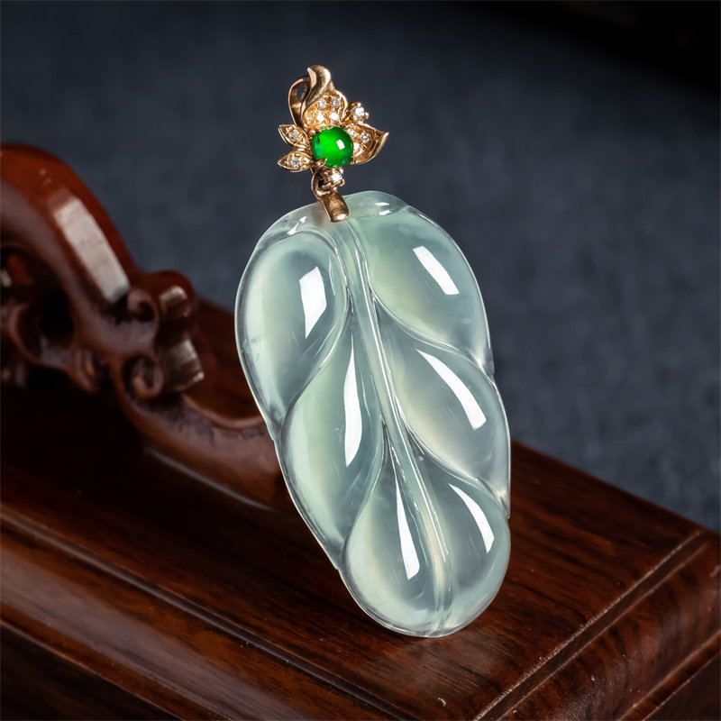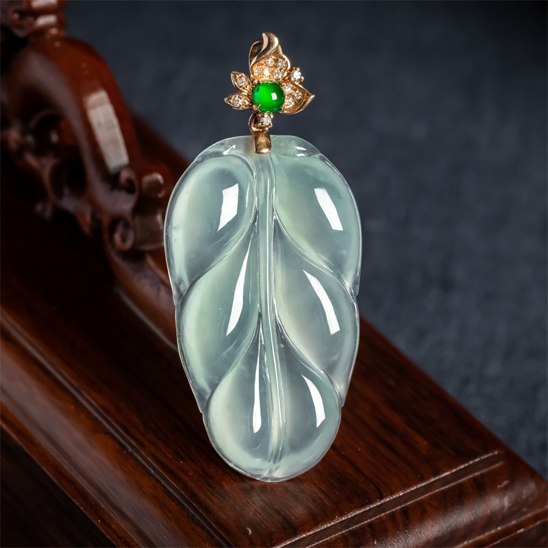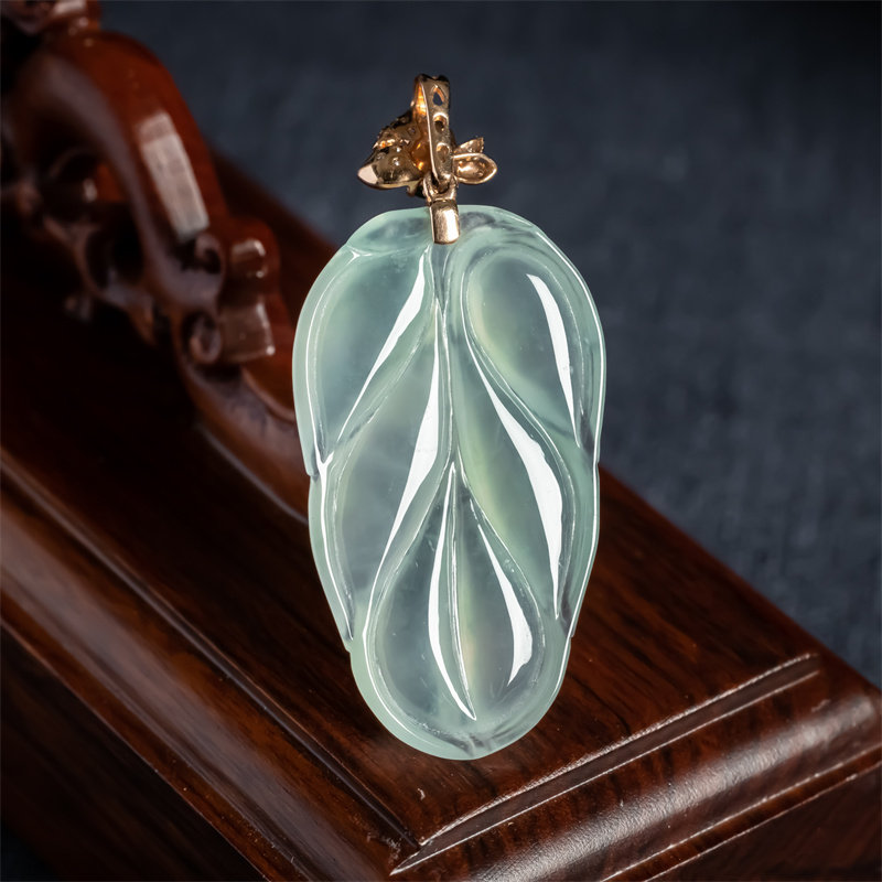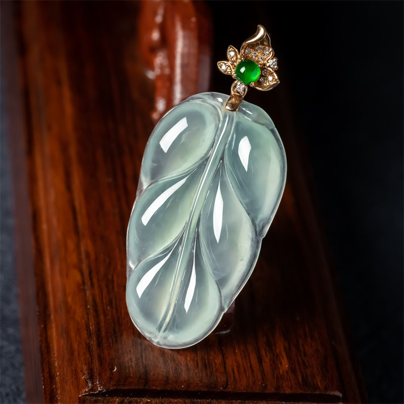 📚 缅甸天然翡翠A货冰种老坑冰透金枝玉叶如意吊坠18K金大业有成挂件