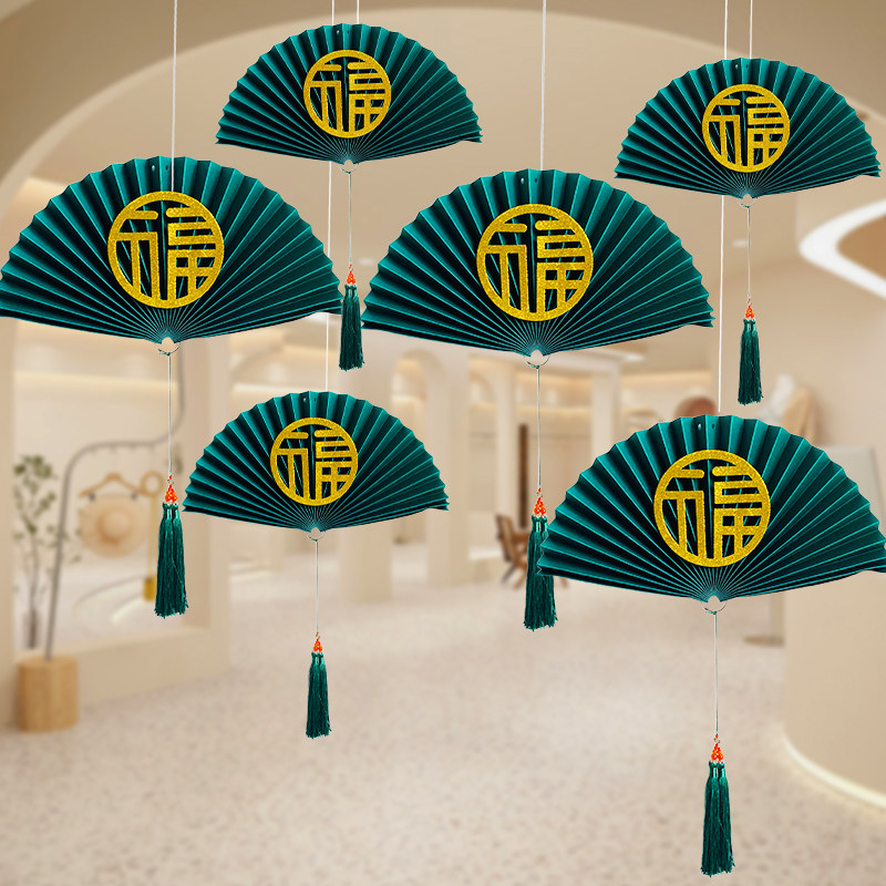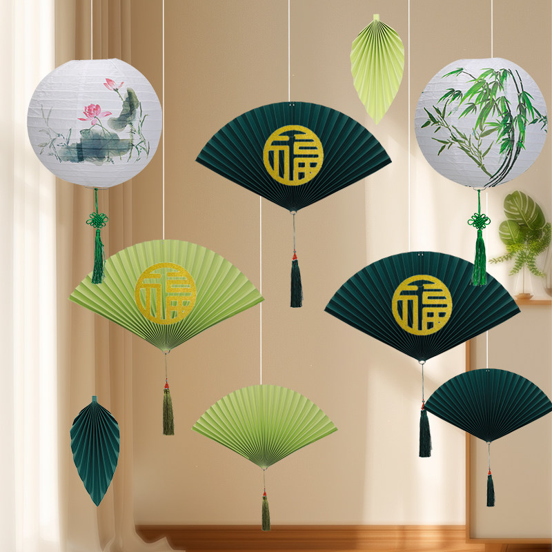 📚 绿色中式纸扇花橱窗吊顶挂件国潮吊饰纸扇灯笼墙面装饰中国风道具