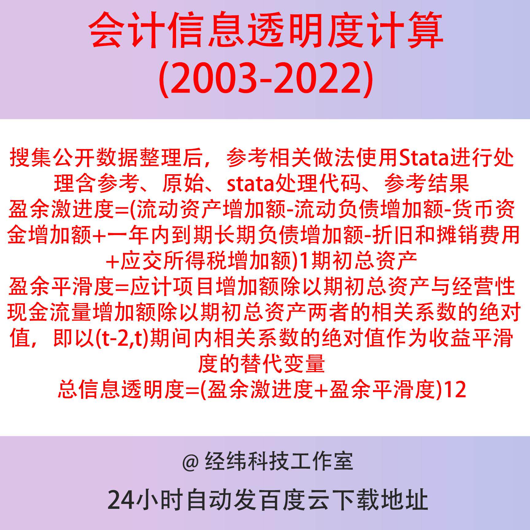 📚 会计信息透明度计算2022-2003盈余激进度 盈余平滑度 含stata代码