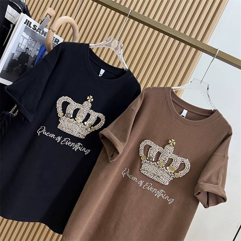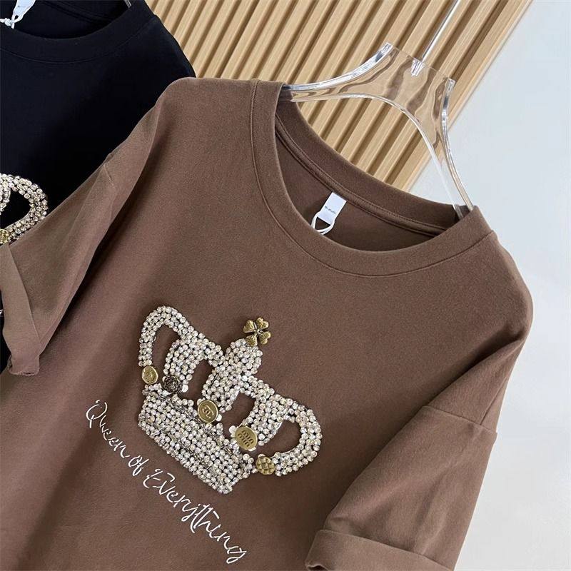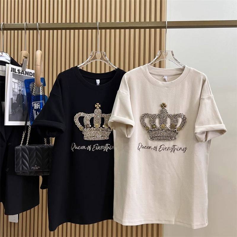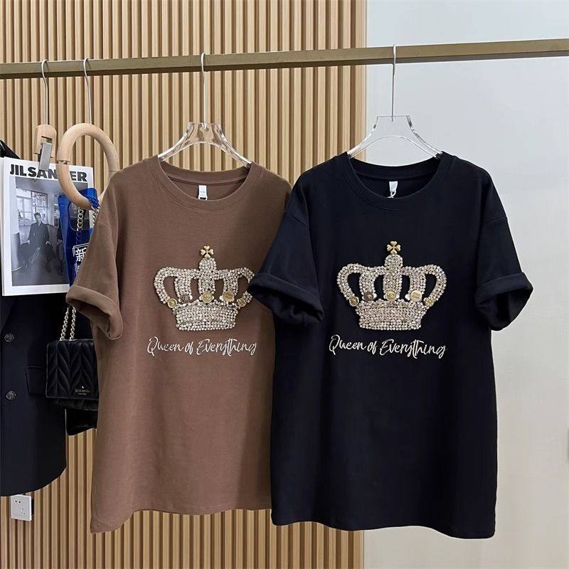 📚 2-300斤胖mm特大码夏天重工刺绣皇冠短袖T恤女打底衫宽松减龄上衣
