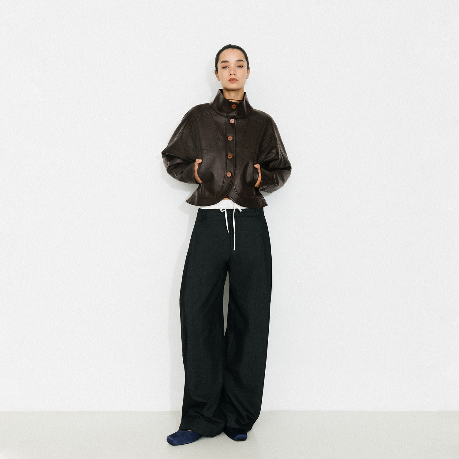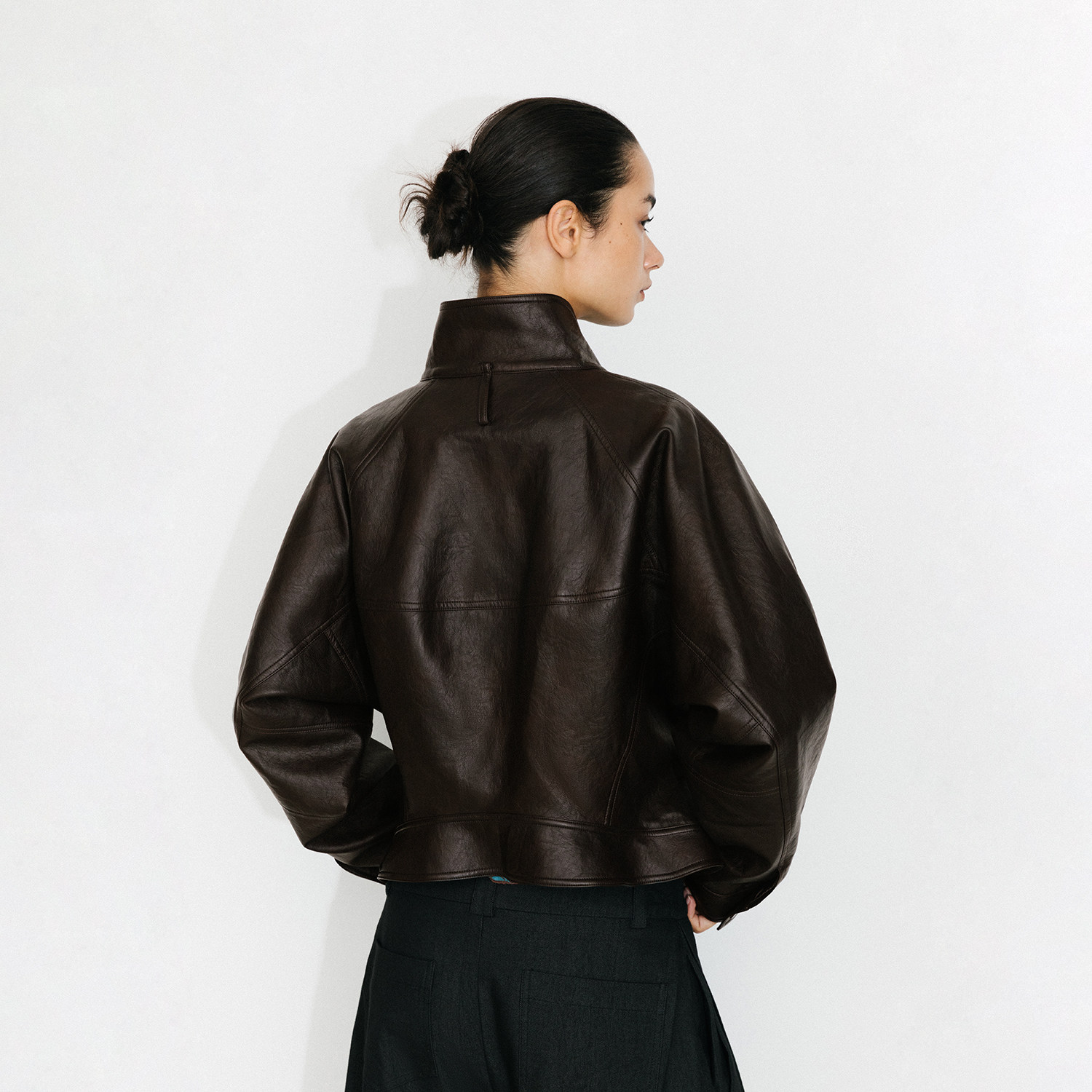 📚 CUBIC深棕色短款宽松立领外套复古摩登休闲感中性风显瘦夹克皮衣