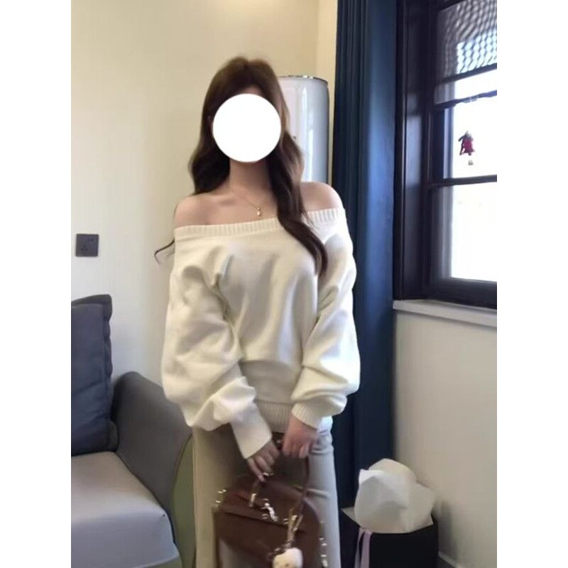 📚 白色一字肩长袖套头毛衣女秋季慵懒风宽松显瘦小个子辣妹露肩上衣