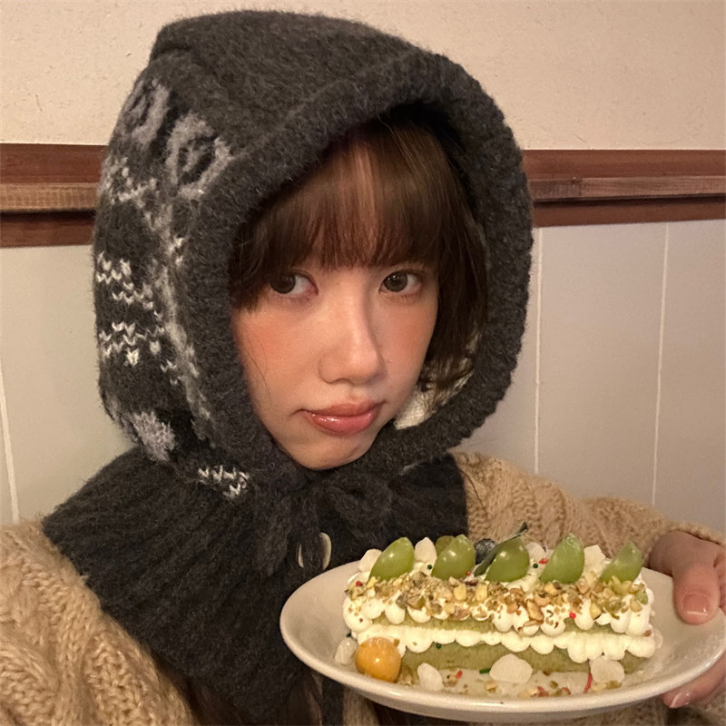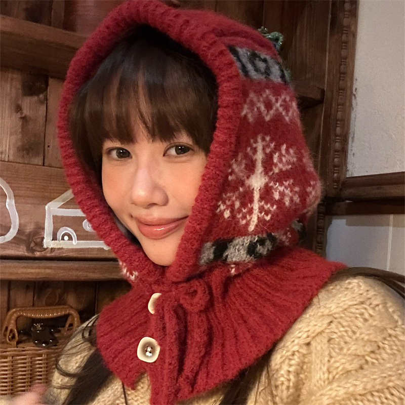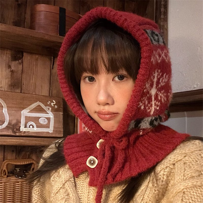 📚 雪花费尔岛风巴拉克拉法帽冬季保暖羊毛混纺针织围脖帽子一体潮女