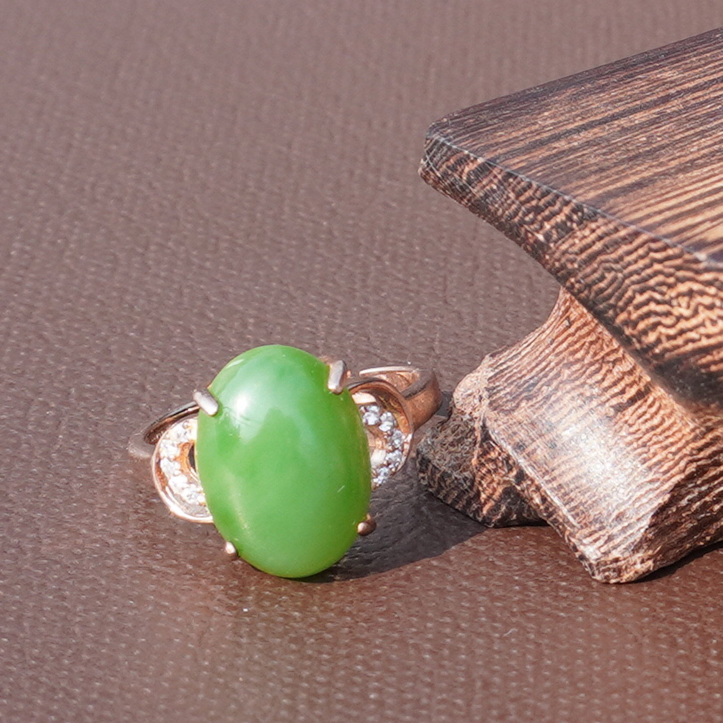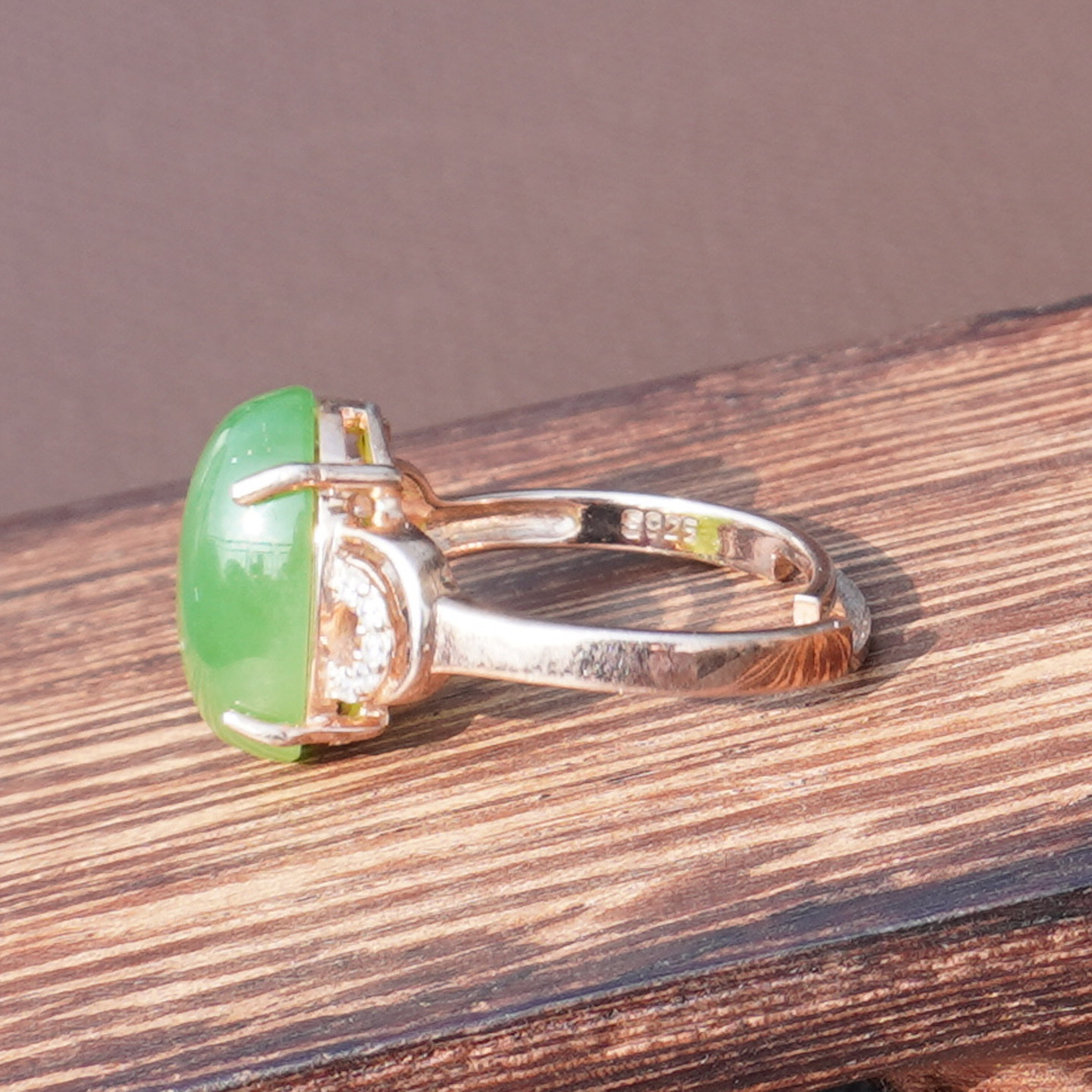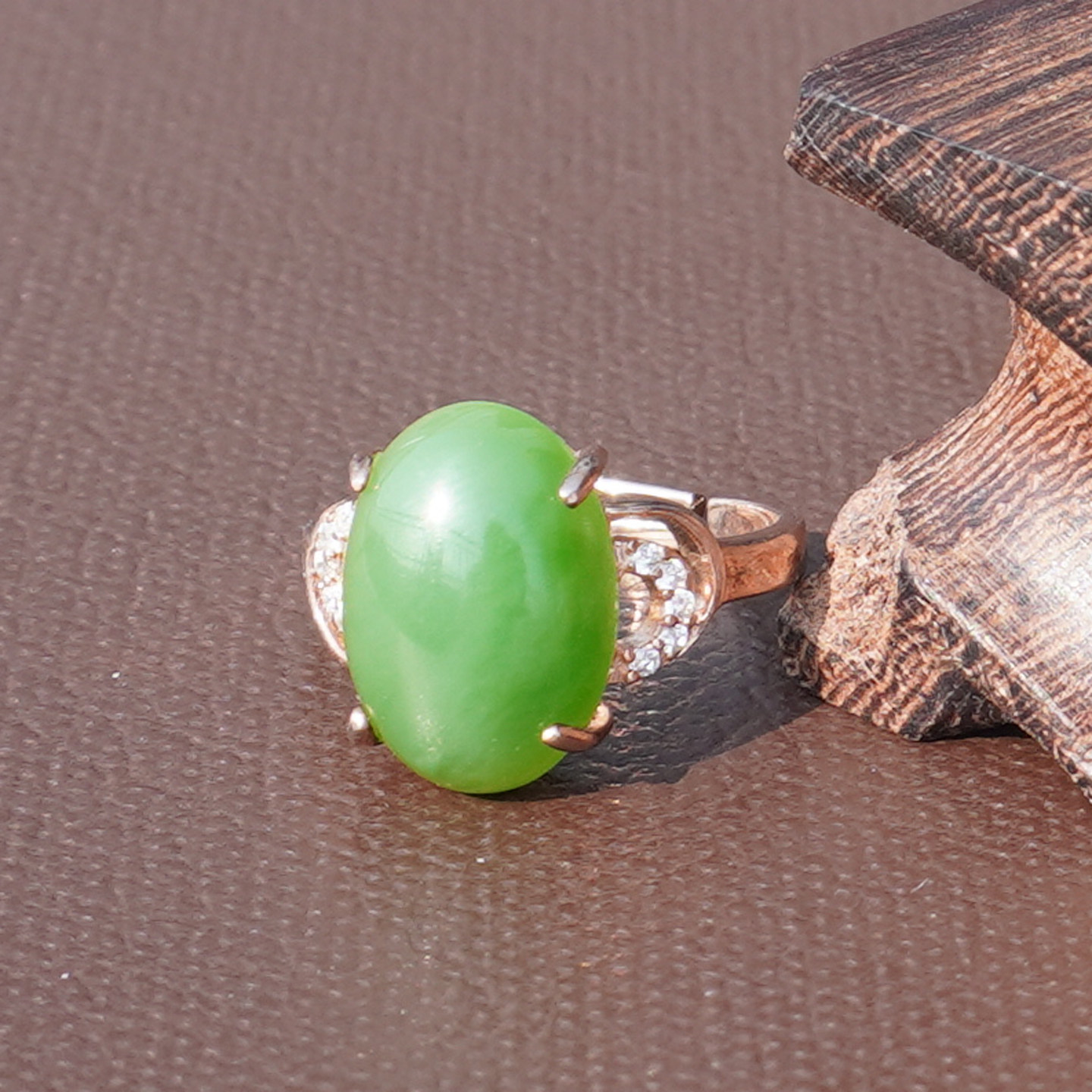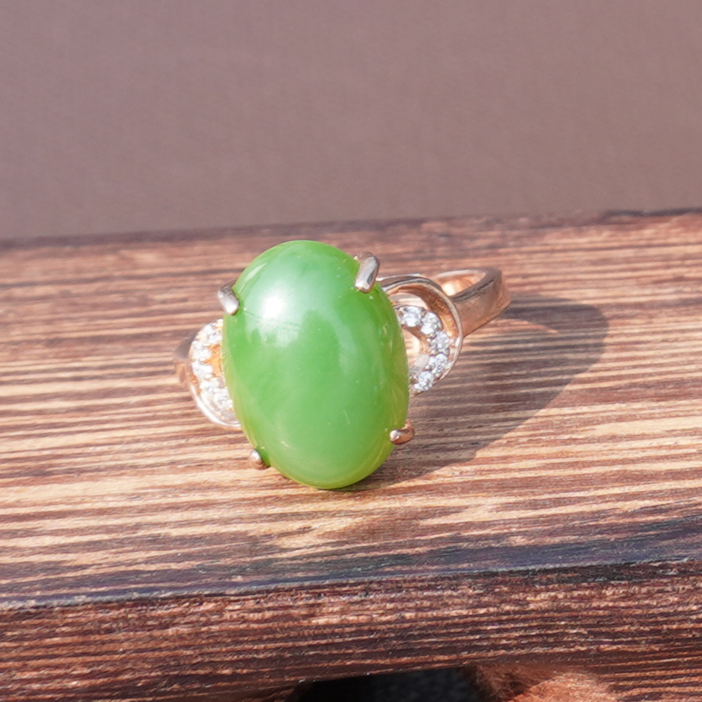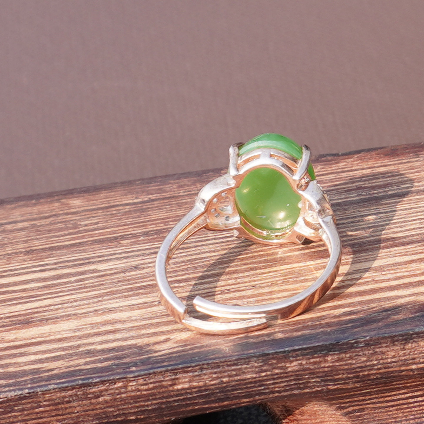 📚 方言和田玉精品俄罗斯老料阳绿碧玉无黑点银镶玫瑰金可调圈戒指A6