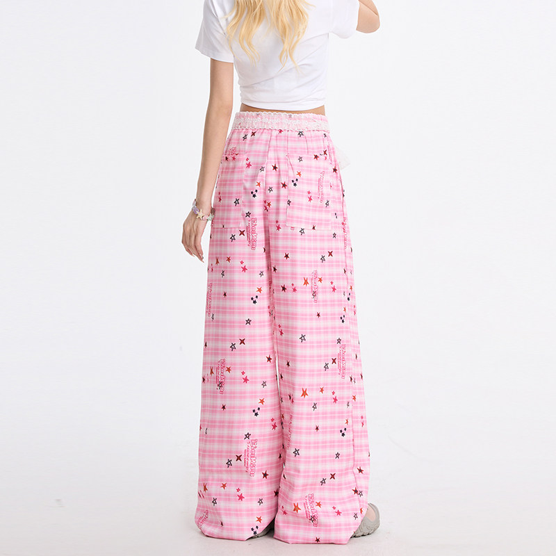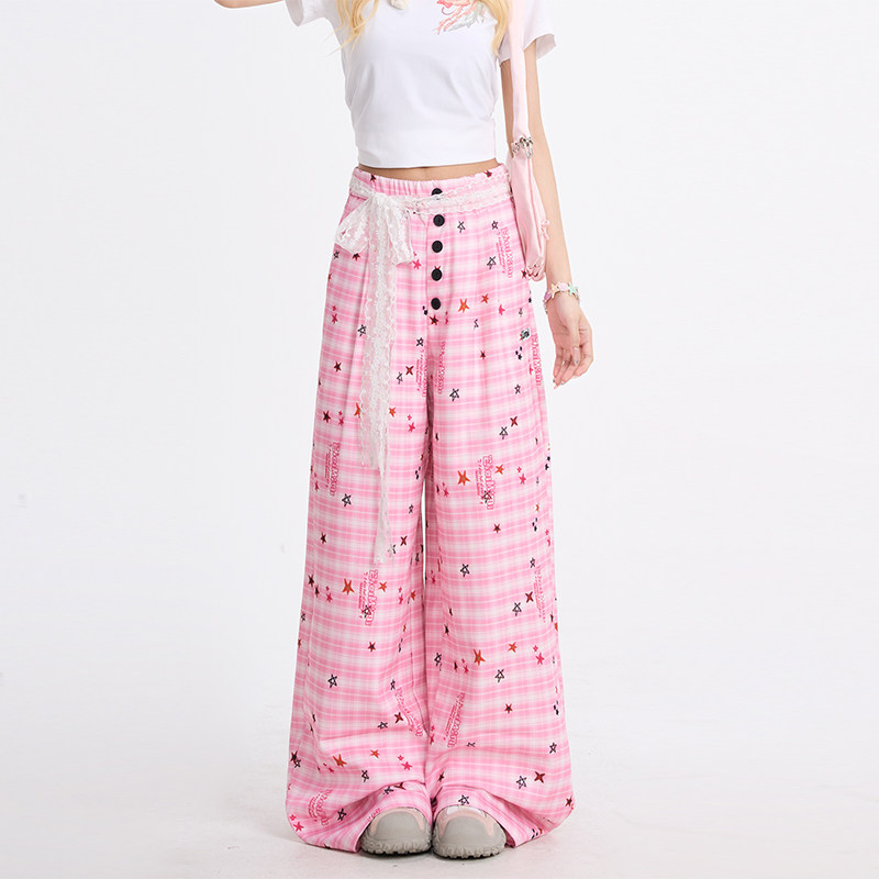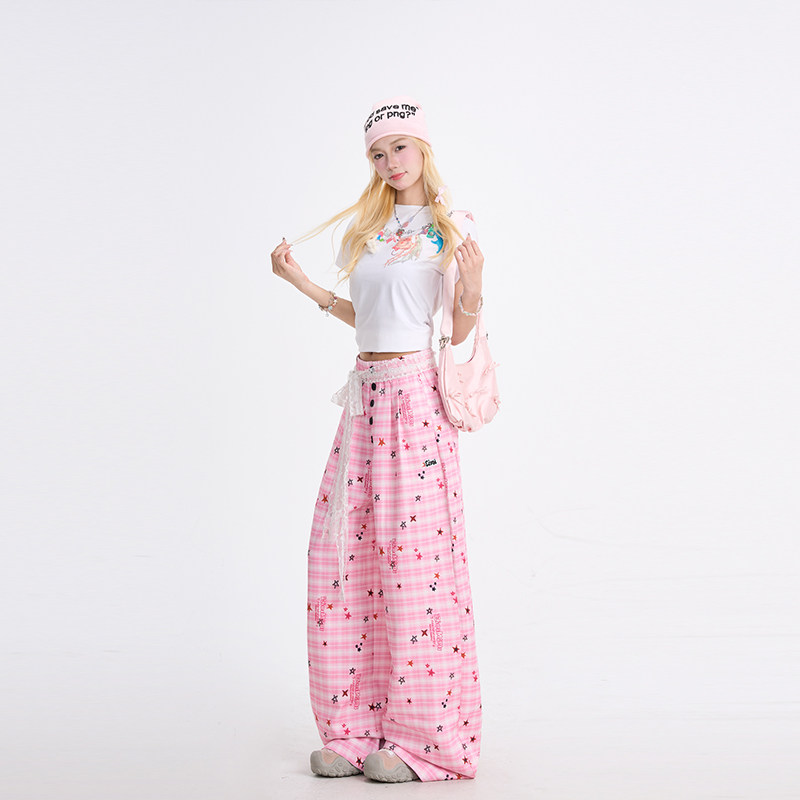 📚 NERESUM满印趣味星星格纹纽扣休闲裤女夏季轻薄阔腿裤多巴胺裤子