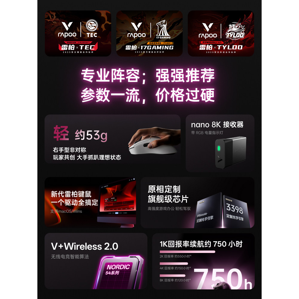 📚 雷柏VT3 MAX无线鼠标PAW3395轻量化双模双8K人体工学电竞游戏通用