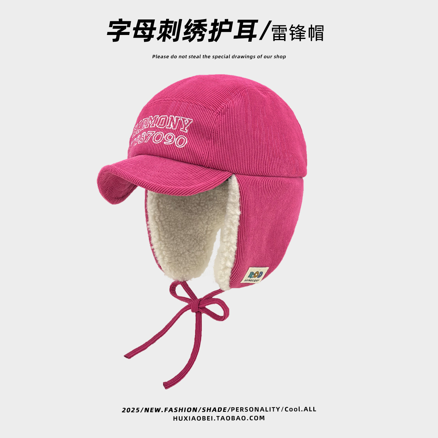 📚 韩版字母刺绣浅粉色灯芯绒雷锋帽女秋冬季出游加厚加绒保暖护耳帽