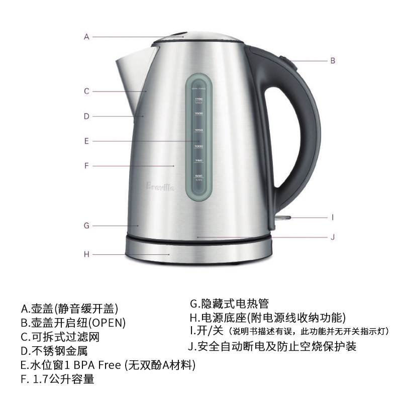 📚 Breville/铂富 BKE.425 家用不锈钢电热水壶防干烧自动断电