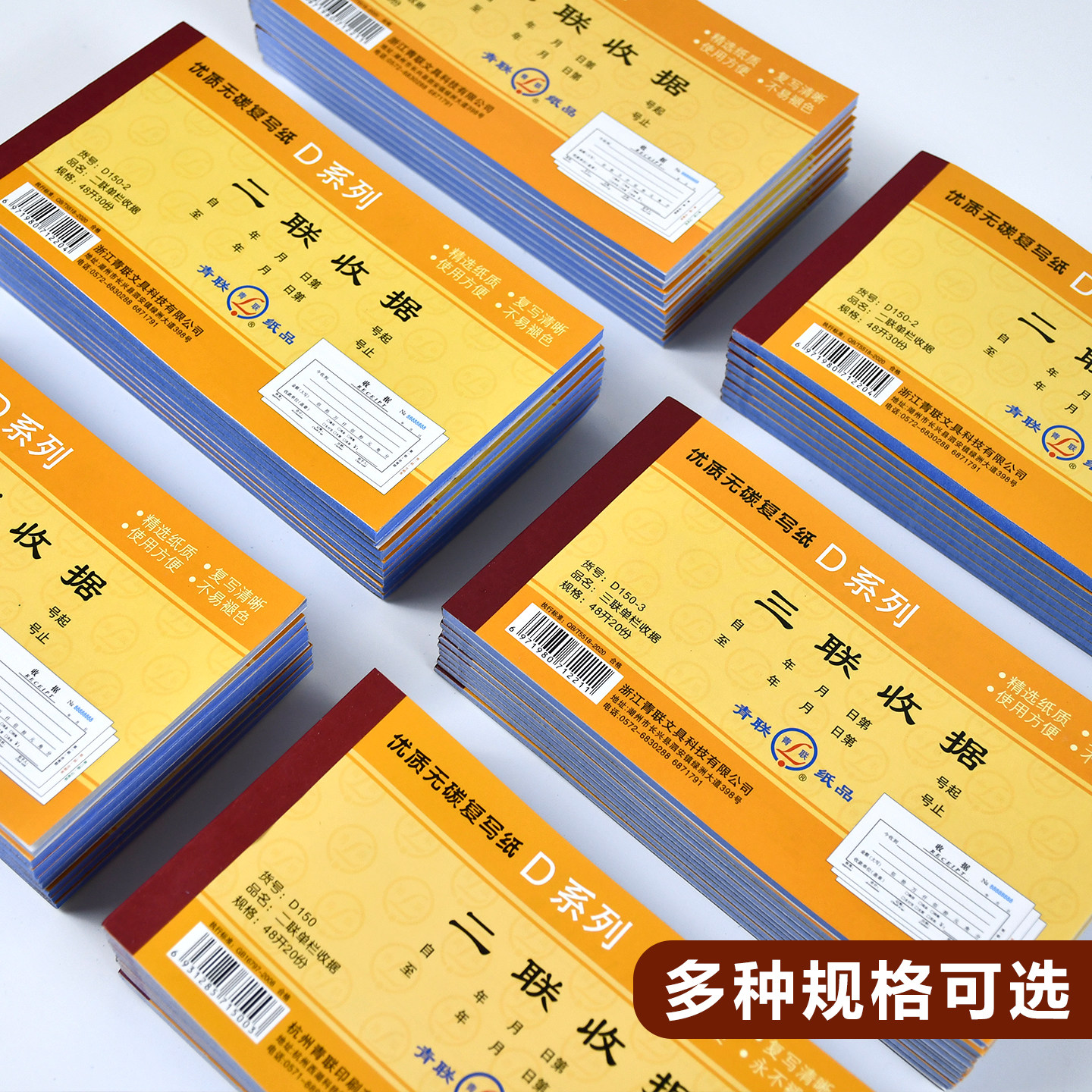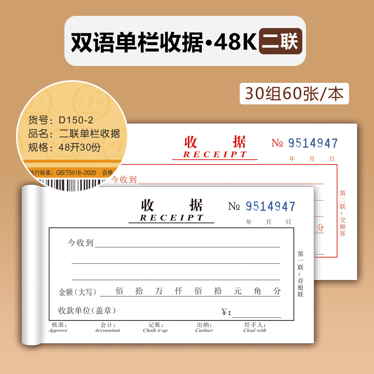 📚 青联D系列48K双语带英文单栏收款收据本二联三联单据优质无碳复写纸两联收据清单票据本跨境外贸广东华南专用
