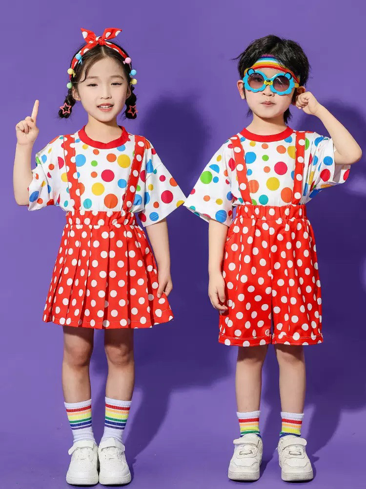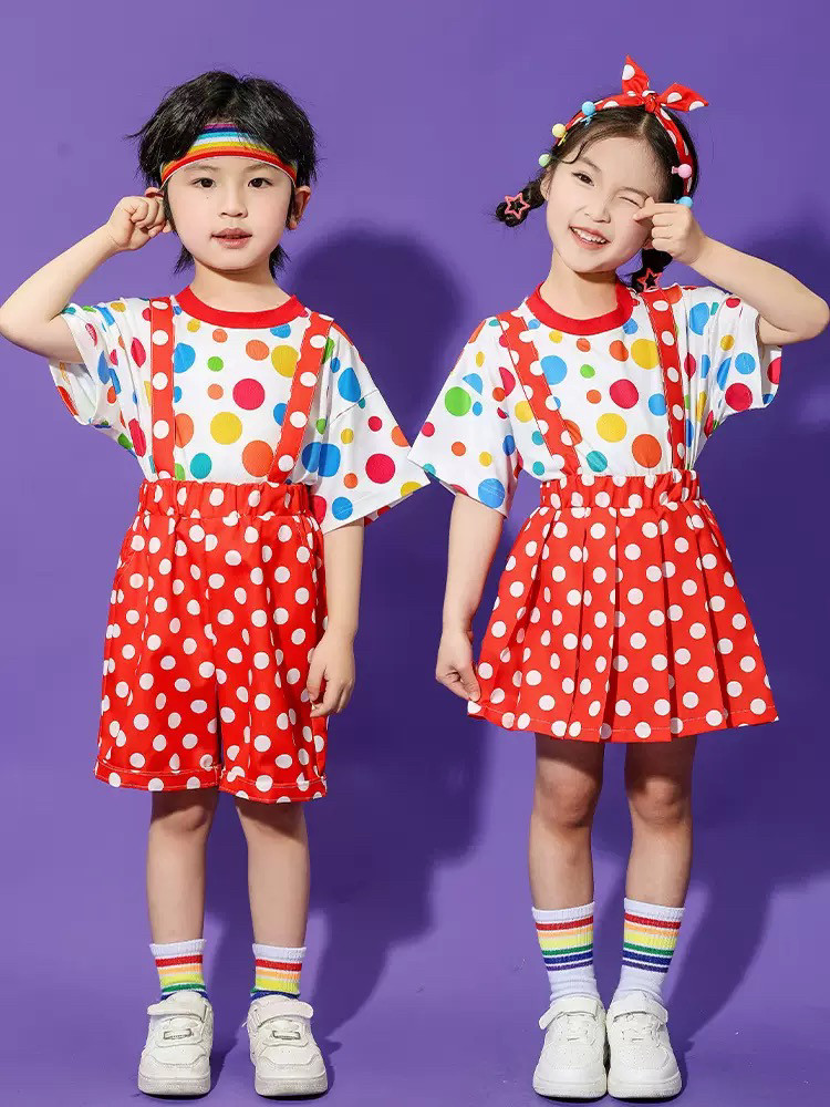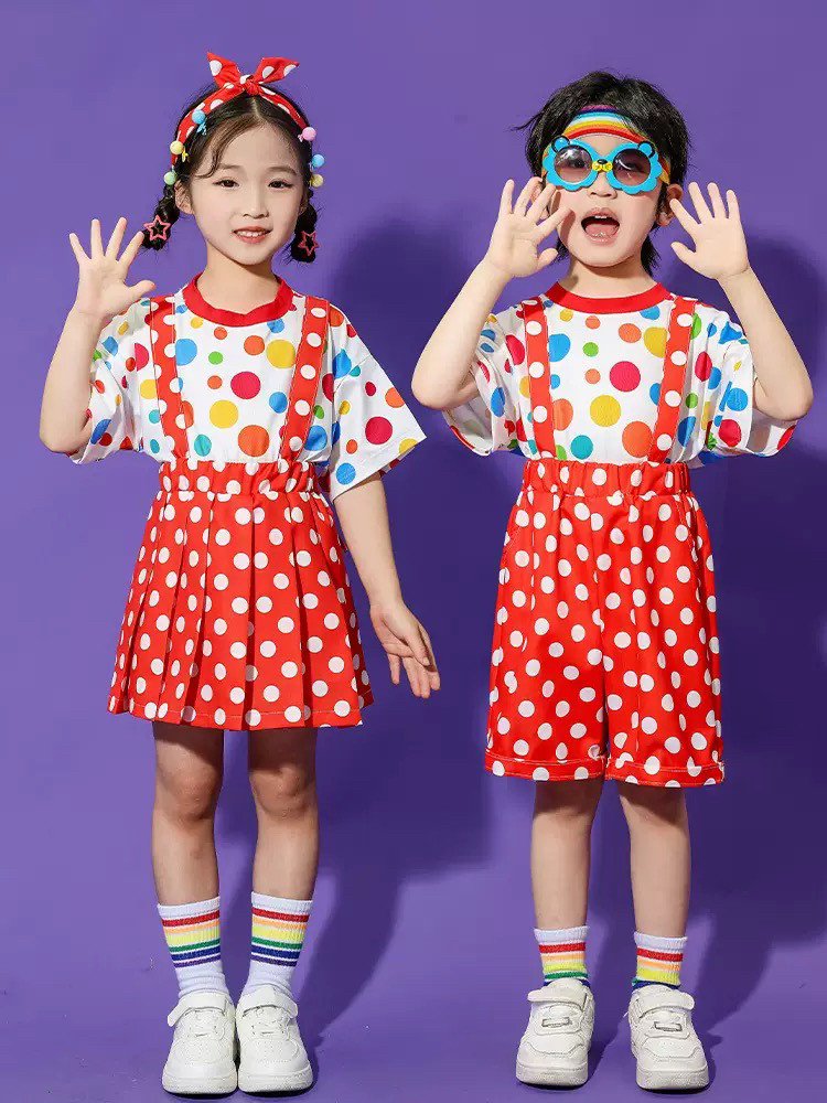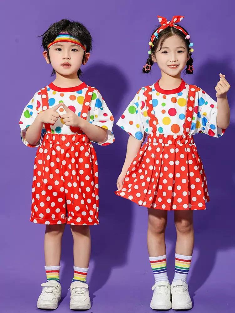 📚 六一儿童表演服装可爱波点红色背带裤舞蹈服男童女童大合唱演出服