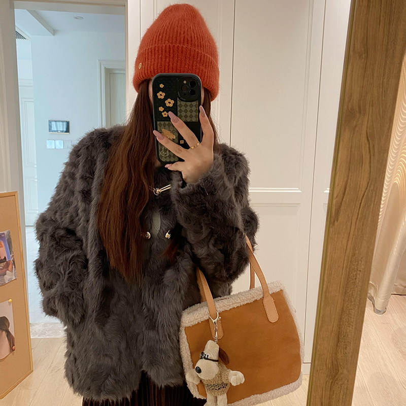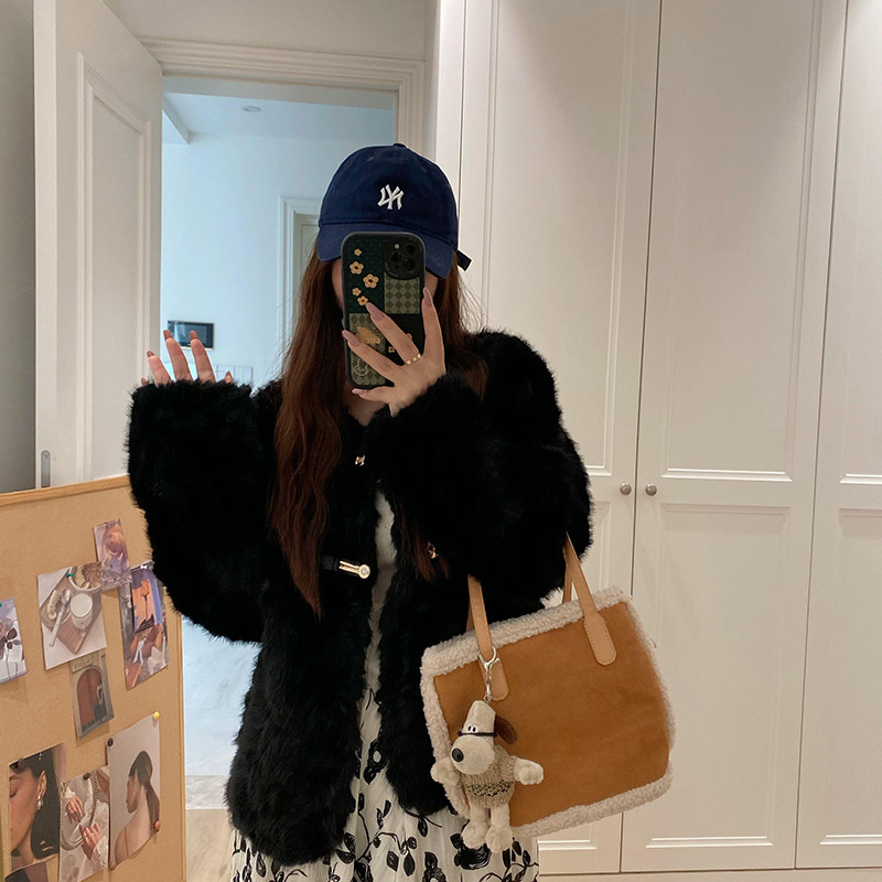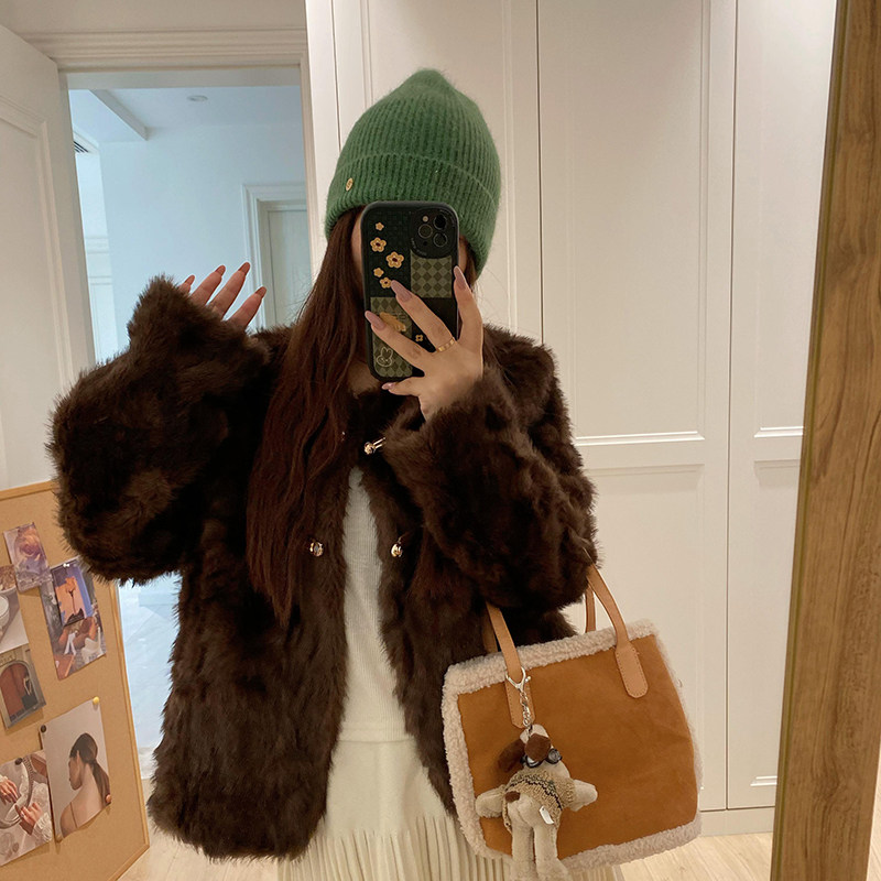 📚 高级感环保皮草仿小湖羊皮毛一体圆领短款吸扣年轻款冬毛毛外套女