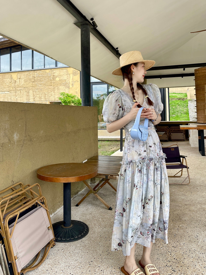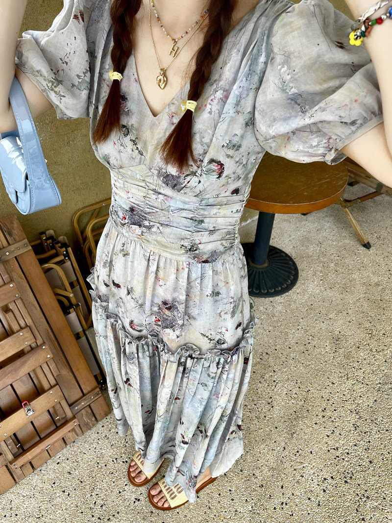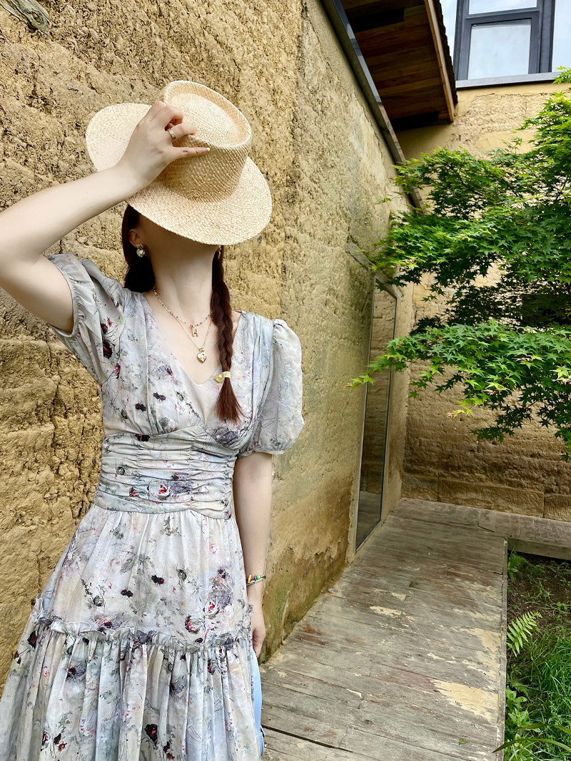 📚 heidy海蒂 53区玫瑰苎麻水墨国风侘寂收腰V领连衣裙南法度假长裙