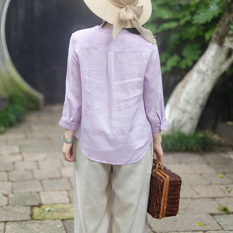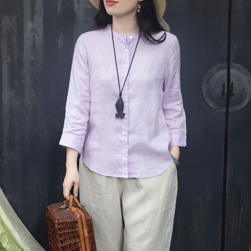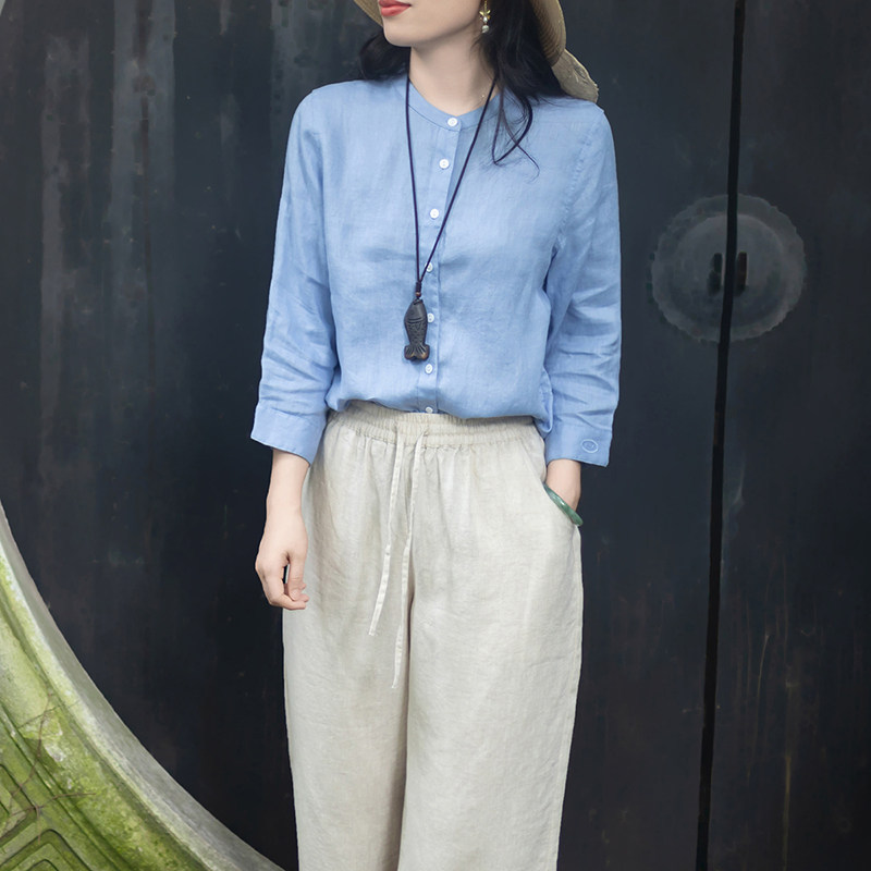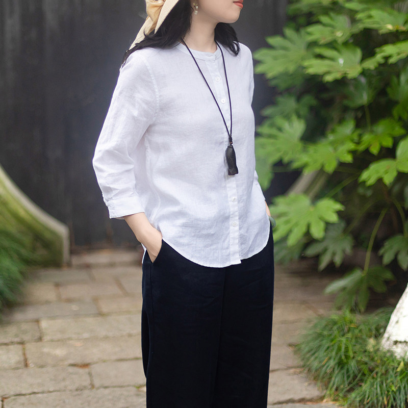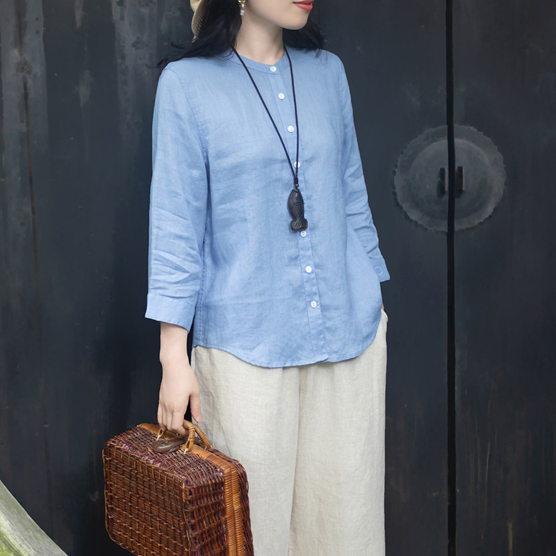 📚 念江南文艺极简风纯色立领松弛感亚麻衬衫透气舒适百搭休闲上衣女