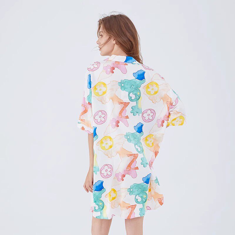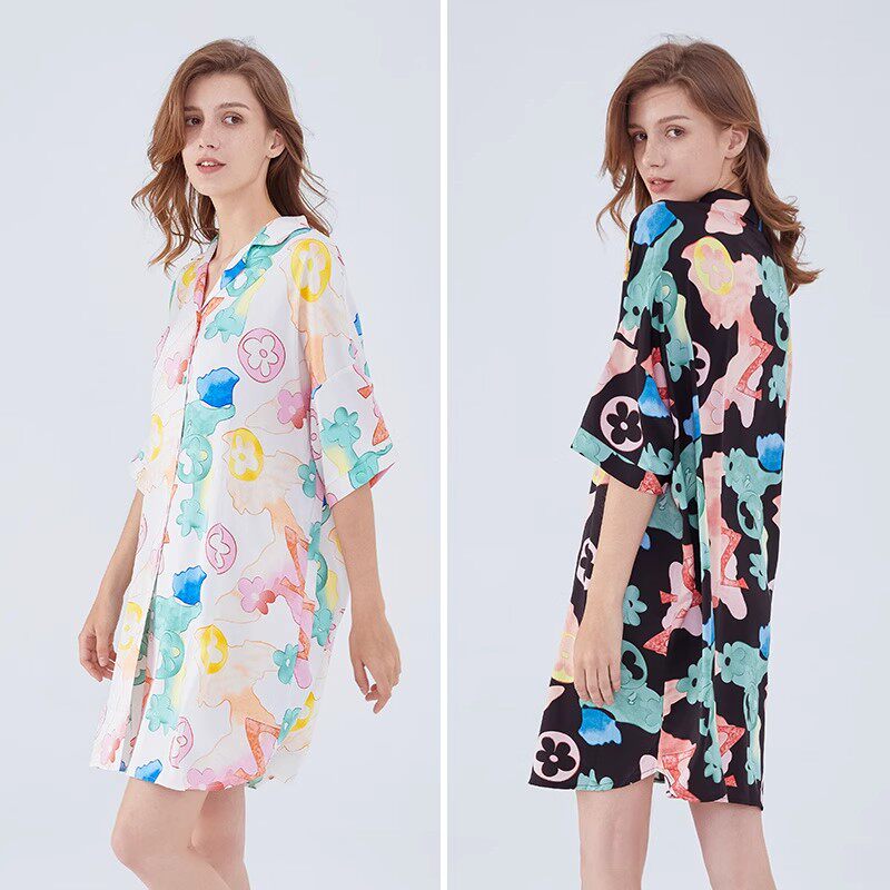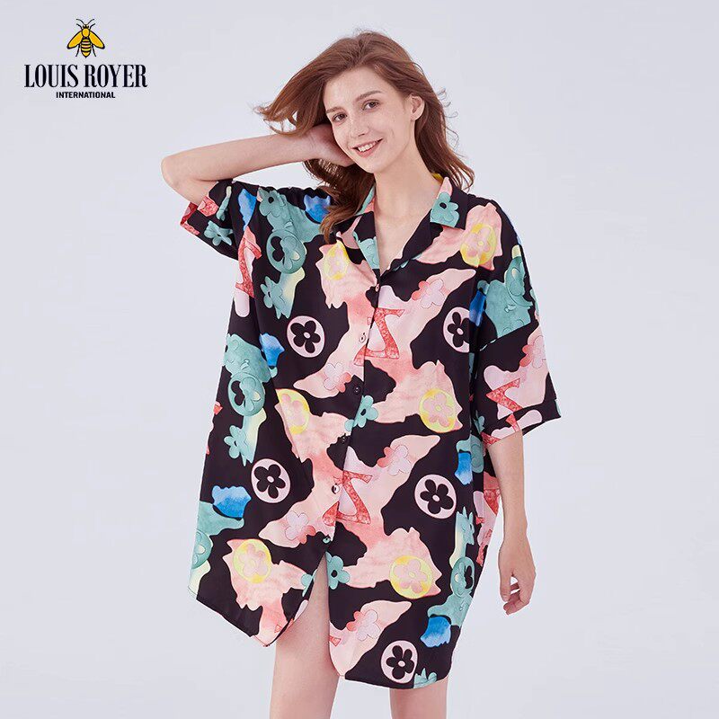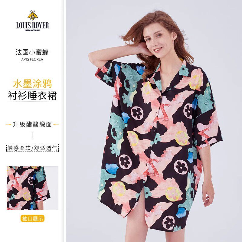 📚 LOUIS ROYER利蜂醋酸缎面水墨涂鸦衬衫式女士家居服睡衣宽松睡裙